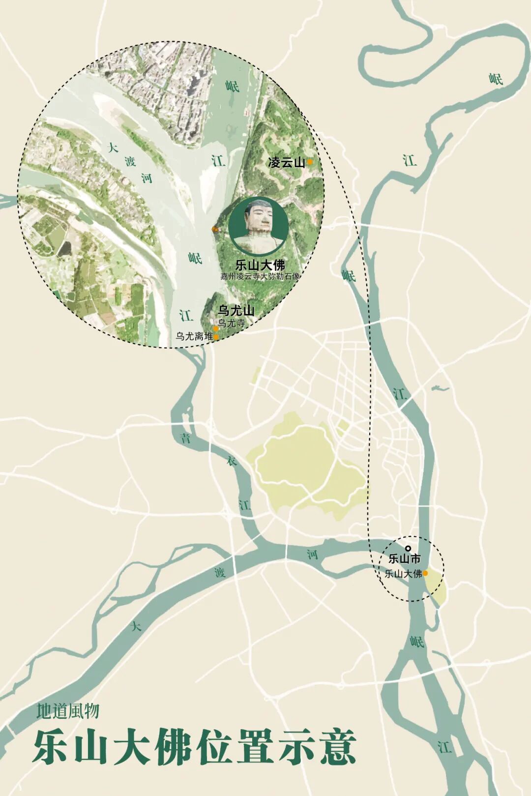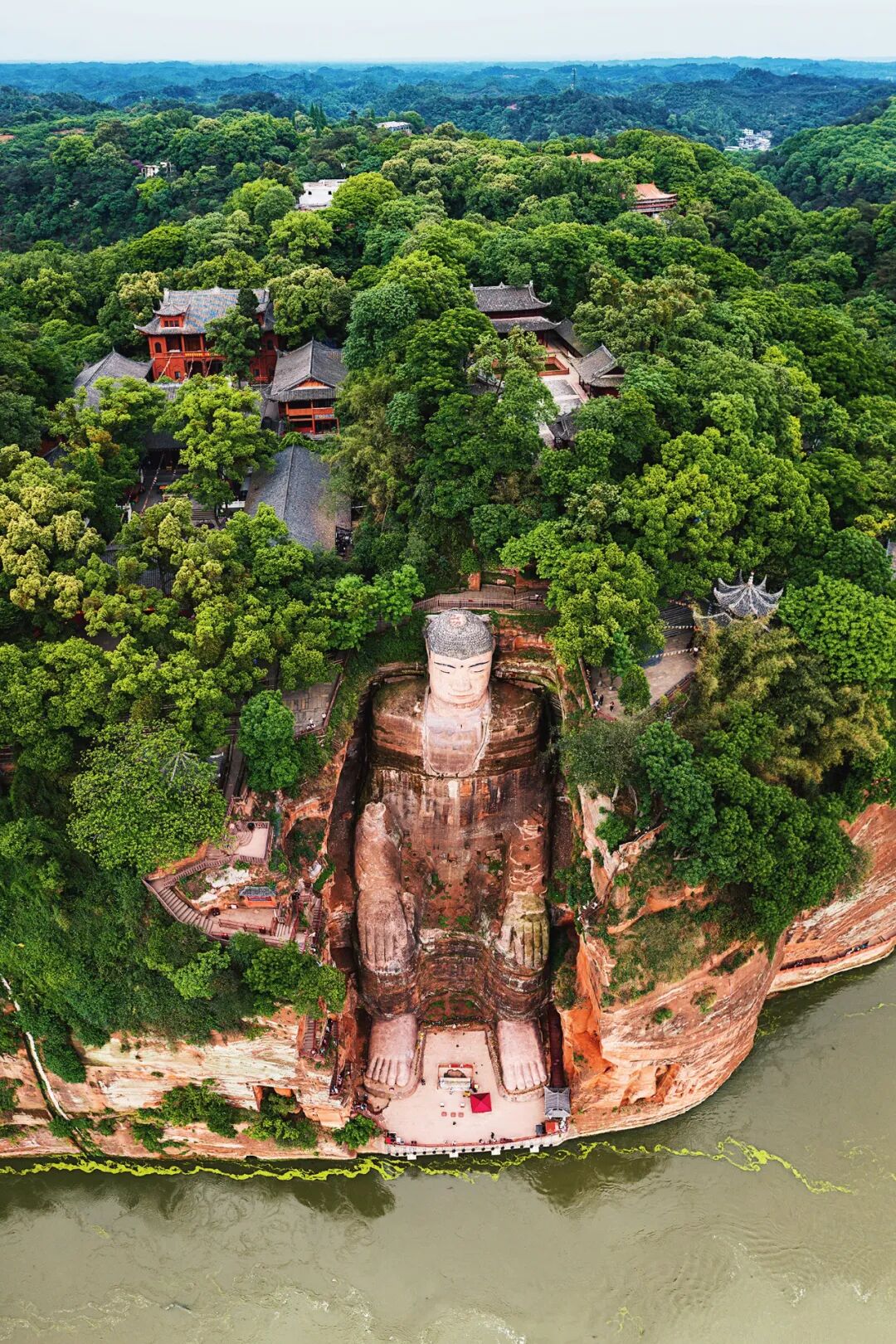 大渡河、青衣江、岷江三江交汇之处,乌尤山、凌云山如佛睡卧,开凿在凌云山丹霞山体上的乐山大佛抚膝而坐,流水堆积砂砾产生的纹理,成为了佛像衣襟上生动的褶皱。