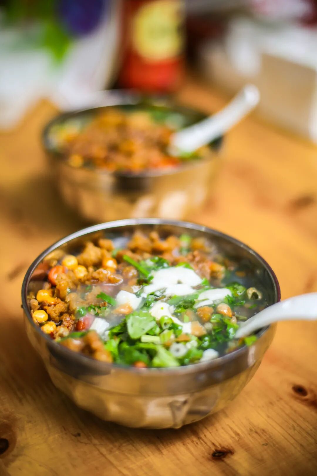 还有全国人民都吃的豆腐脑,大半碗都是骨头汤勾芡而成的浓汁,只有薄薄一层豆花浮在上面,加上厚重的炖牛肉,再拌上剁碎的大头菜、炒黄豆、炸花生米,佐以小笼粉蒸肥肠,“峨眉派”的还要加上酥肉,“牛华派”的则放入粉条撒子。