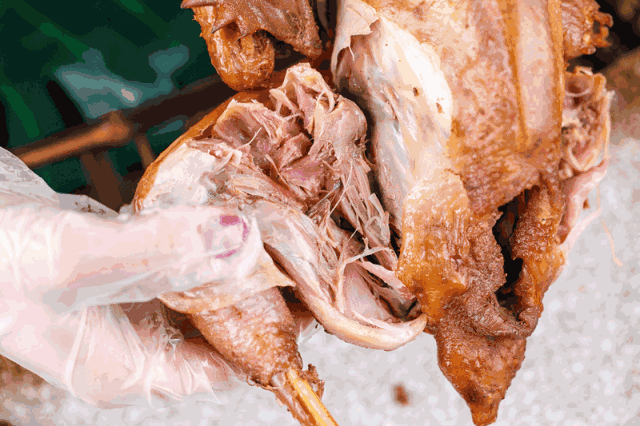 碰巧赶上刚出锅的,捧在手里还热乎着,立马蹲在马路牙子上来一口,这才是它最香的归宿。要说东北人的接头暗号,除了“你瞅啥”,一定还有徒手撕烧鸡、蹲地啃烧鸡。