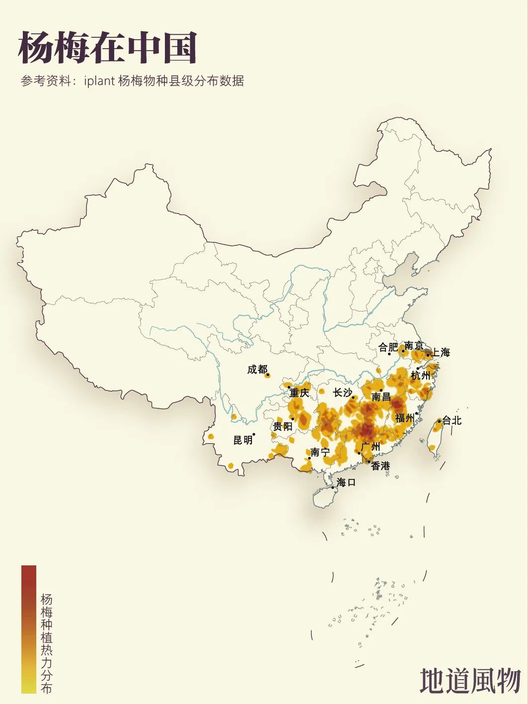 杨梅喜爱丘陵地北山坡的红、黄弱酸性土壤以及温暖湿润的气候,因此我国的杨梅大致分布在北纬20°至31°之间。与荔枝不同,春天的第一口杨梅并不来自中国的最南端,而是隐藏在滇黔高原的一座神秘小县城里。