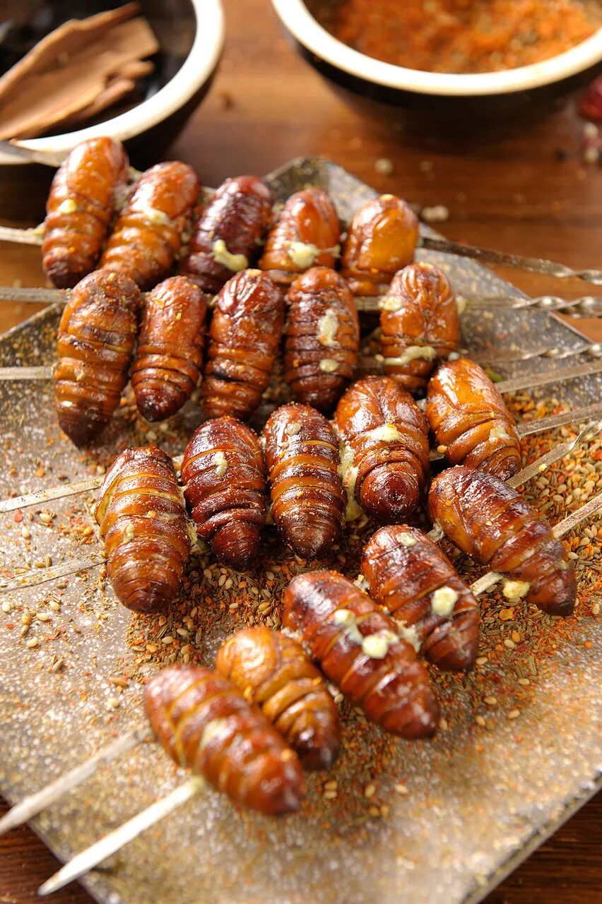 辽源的烤蚕蛹,听起来似乎还能接受。但将初夏正在蠕动的青蚕(蚕蛹的前身)串起来直接烤,那画面简直不敢看。