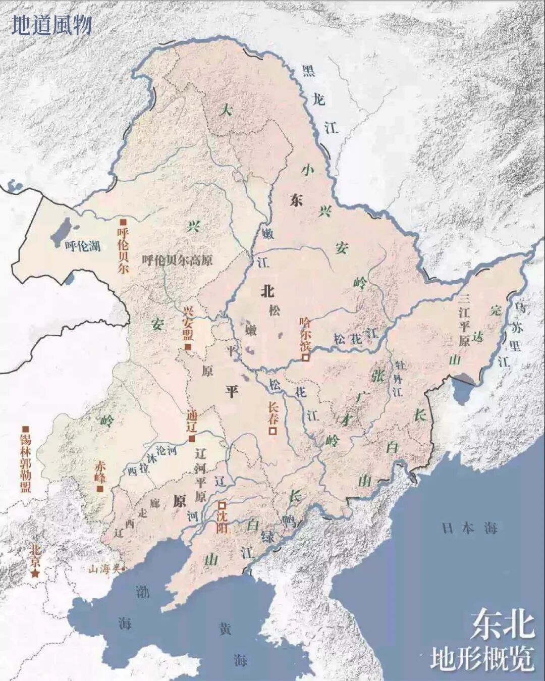 ▲ 东北地形图。东北地区除了东三省,还包括内蒙古东部的“三市一盟”。本文描述范围主要为黑、吉、辽三省。制图/F50BB