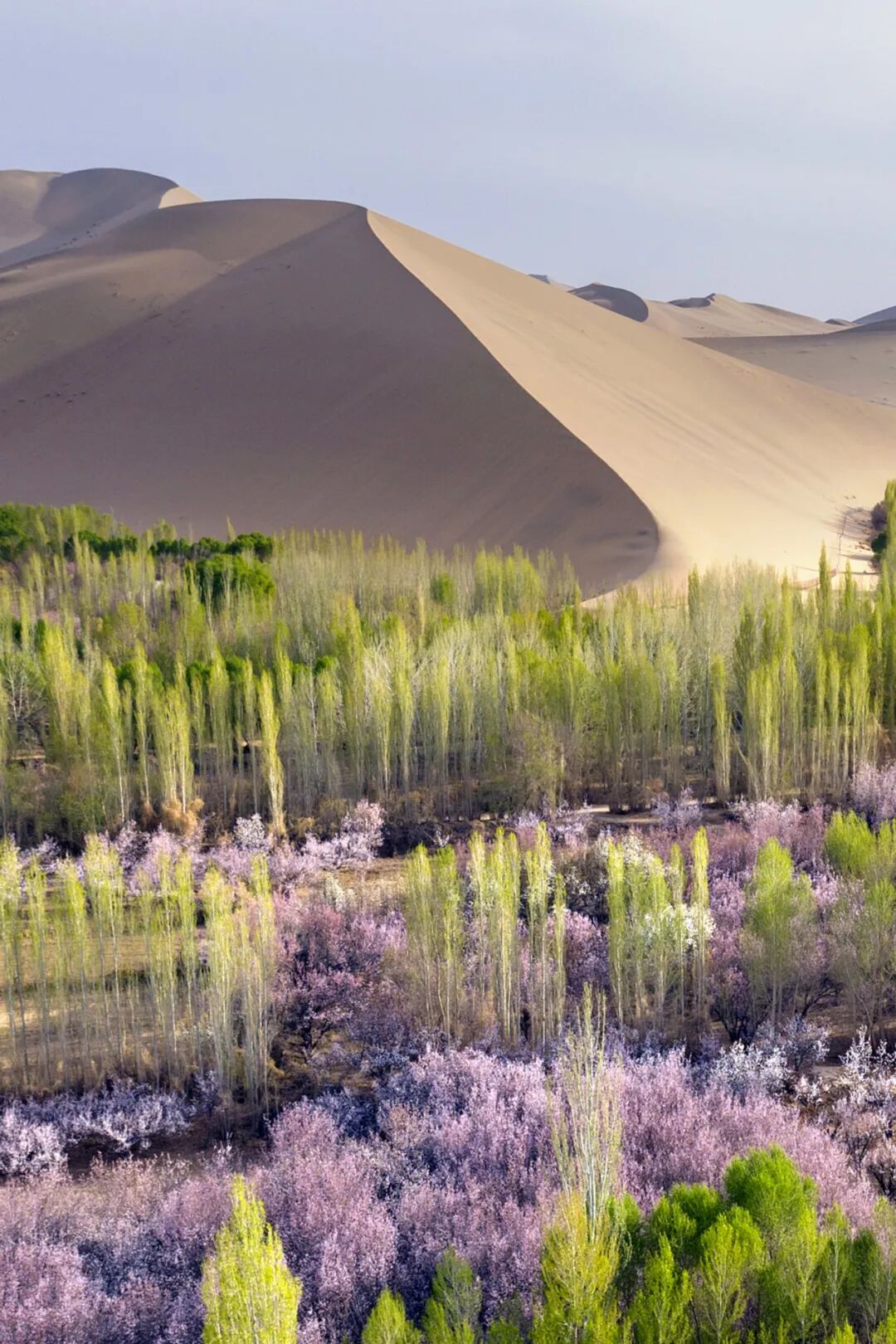 ▲ 甘肃敦煌,鸣沙山下杏花绽放。 图/视觉中国