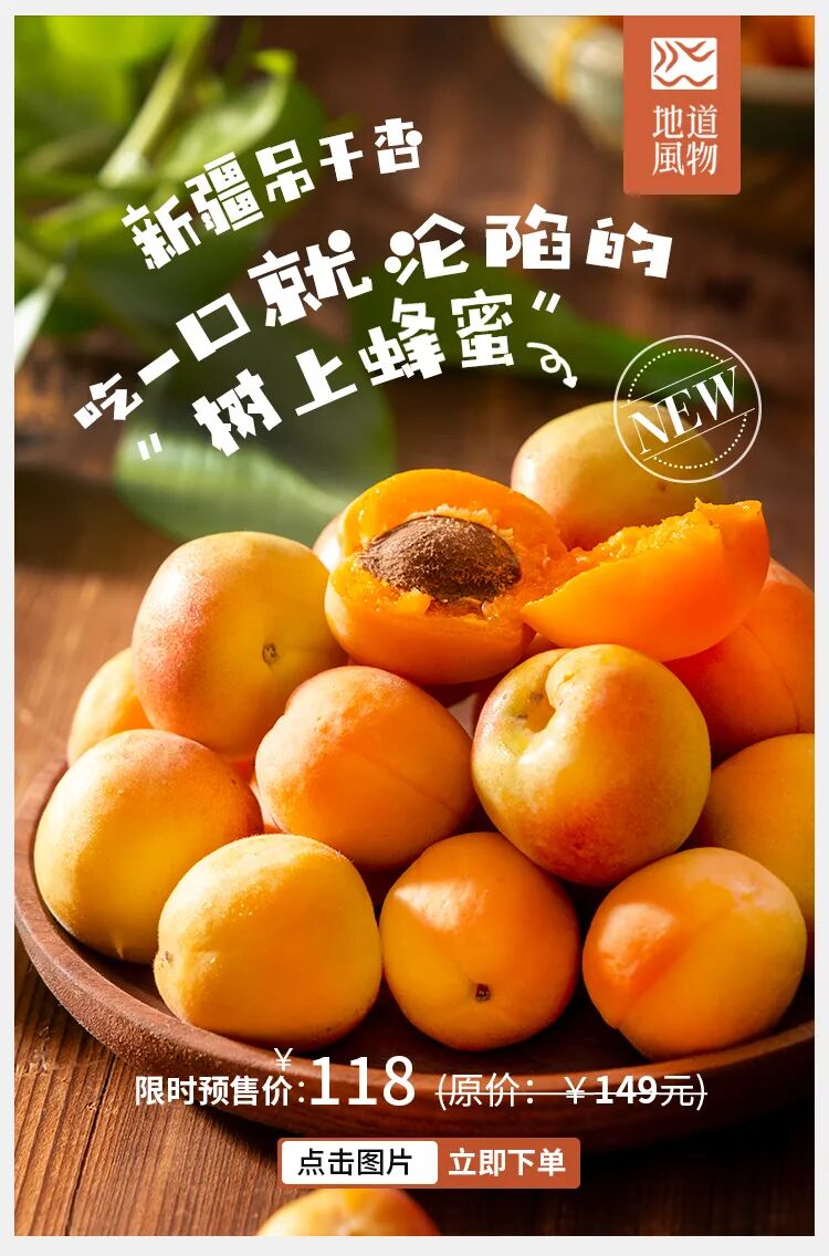 吃完鲜果,新疆的果脯杏同样惊艳。北疆伊犁地区的吊干杏(“树上干杏”),因其熟后不落,受干燥季风的吹拂,在树上风干而得名。这里平均日照时长达到16小时以上,昼夜温差非常大,所以吊干杏的鲜果本身就甜味四溢,被誉为“红色蜂蜜“,果干则肥厚细腻,糖分和酸味刚刚好,难怪被称为“果脯之王”。