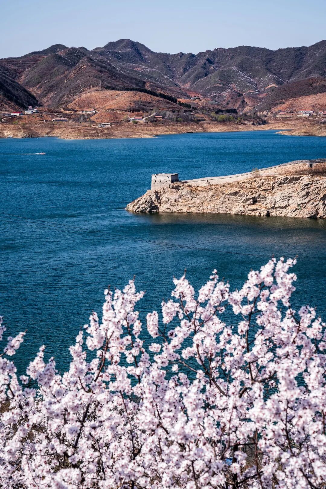 ▲ 河北承德潘家口长城隔着水库与杏花遥遥相望。 图/视觉中国