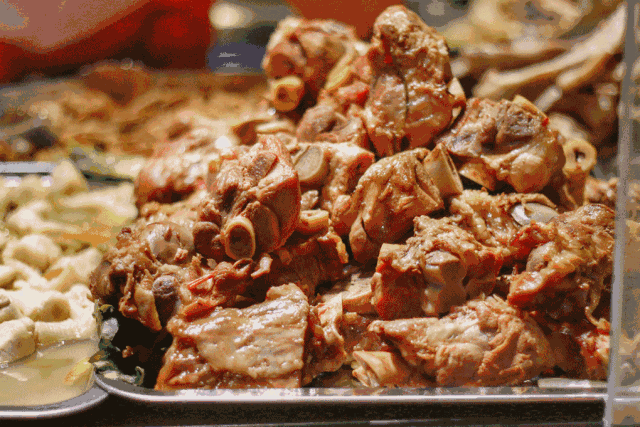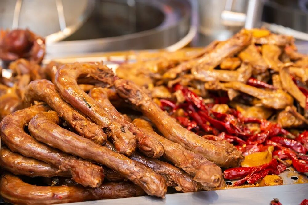 随意取一根送入口中,一边“啃嘬撕咬”着弹嫩筋道、甜中有辣,辣中带麻的脖间肉,一边孜孜不倦地在骨架上吮吸着最后一口香辣,末了还不忘舔干净手指上的余香,让人回味无穷。
