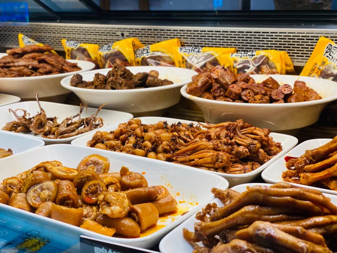 像四川的卤菜,口感麻辣咸,花椒居多;广东的卤菜,咸味较轻,类别也更多,例如烧腊、白切鸡、潮汕卤水等,香气浓郁;还有湖南武冈的卤菜,以数十种药材入味,既辣且养生。