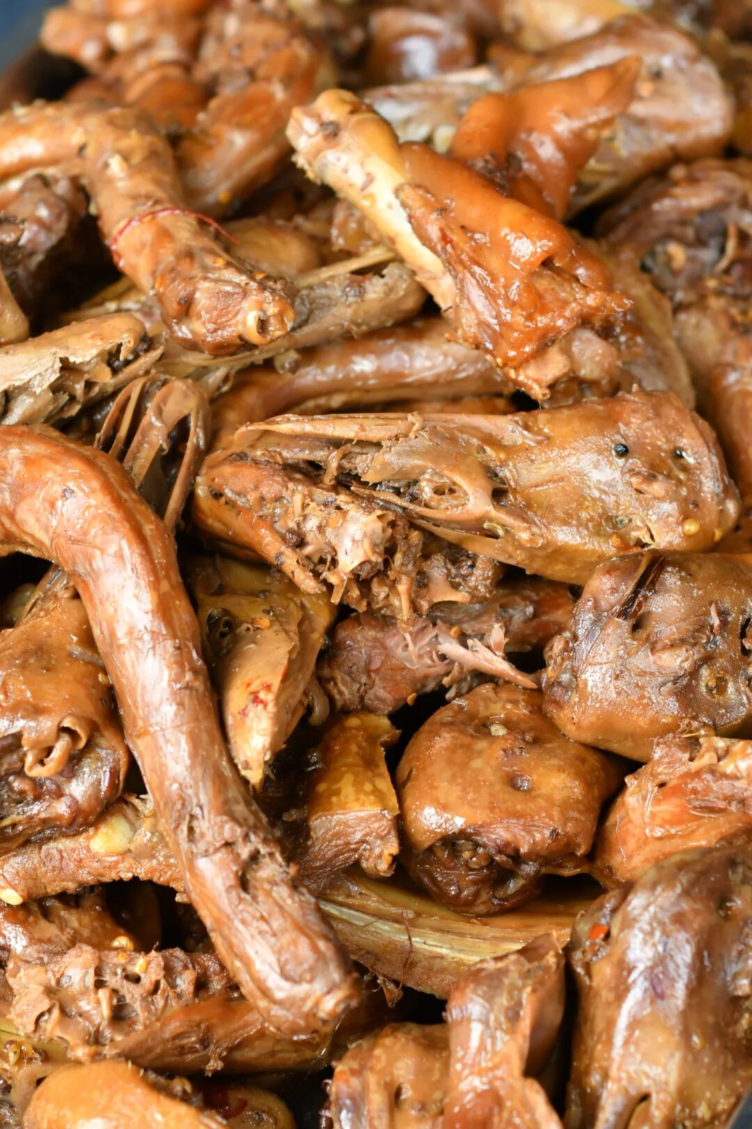 看似不起眼的鸭脖,在经过卤水的洗礼后,都具有了无穷的魅力。紧致的鸭脖肉吸收着卤香,拿捏适度的时间,使卤味不会过于强烈,也不会浮于表面,在正好达到满而不溢时取出,一根根“功德圆满”的卤鸭脖才终于千呼万唤始出来。