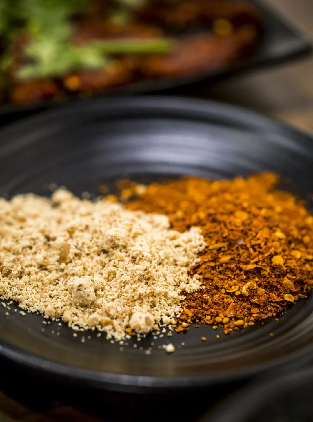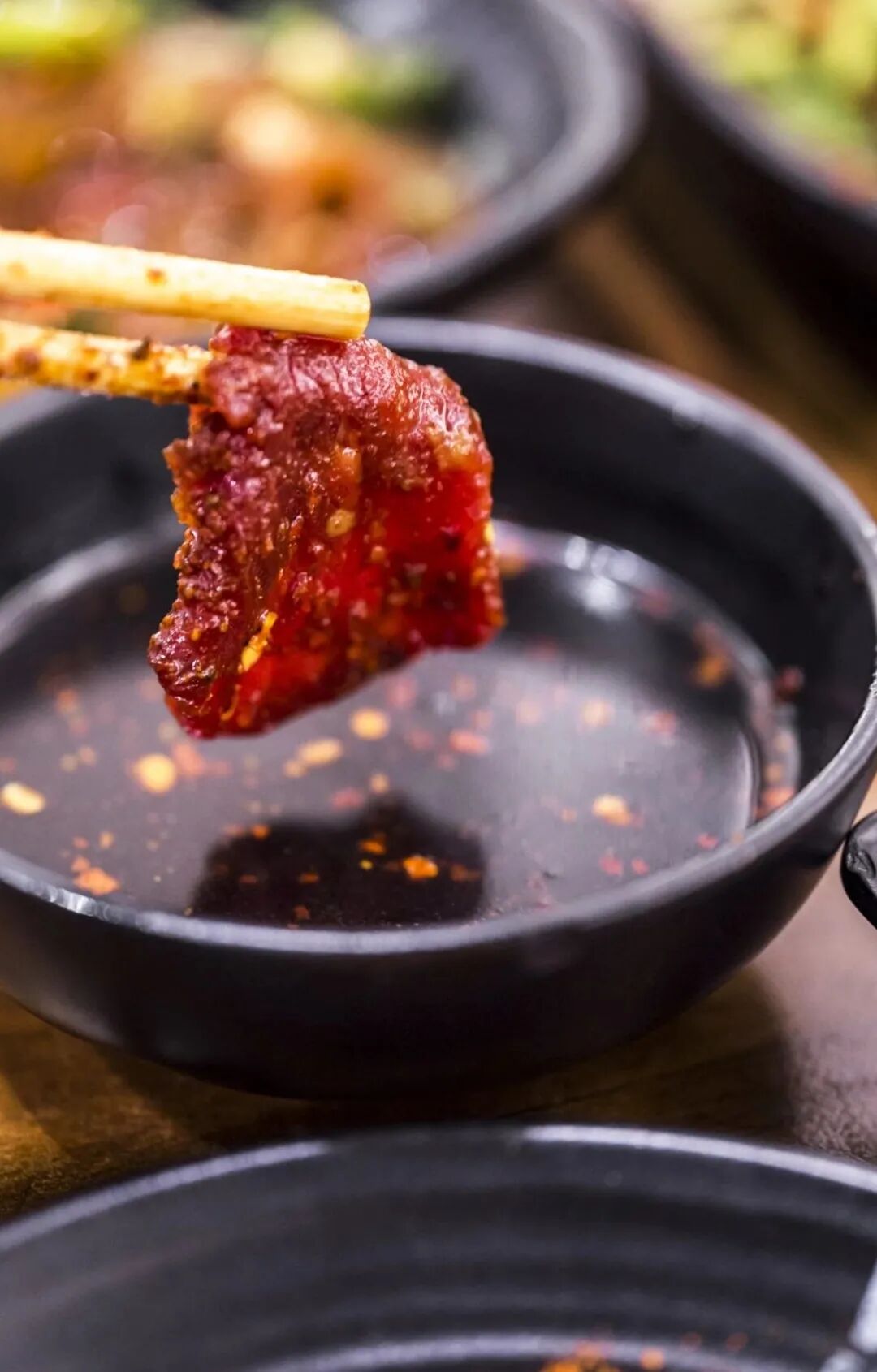 切得大而薄的牛羊肉片,在烤制前浸入特制油汤,飞上铁板,在火焰中翻烤几下,就能品尝到民间第一手“火上飘”了。石棉的蘸碟标配一般为辣椒粉、花生粉、豆面、芝麻粉,依据个人口味还可以加糖醋汁。