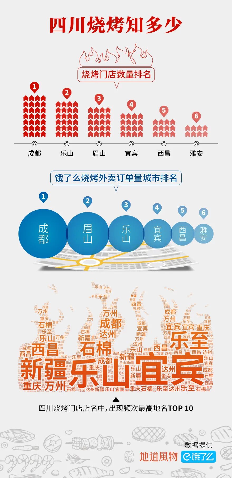 ▲ 四川烧烤门店店名中,出现频次最高地名前十分别为“宜宾、乐山、新疆、乐至、石棉、西昌、成都、万州、重庆和达州”。 设计/刘航