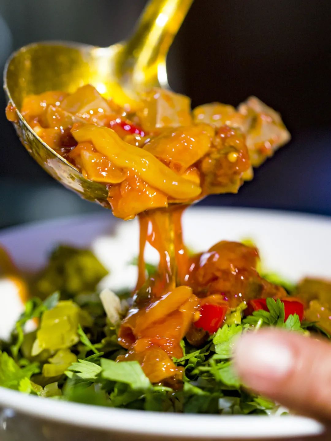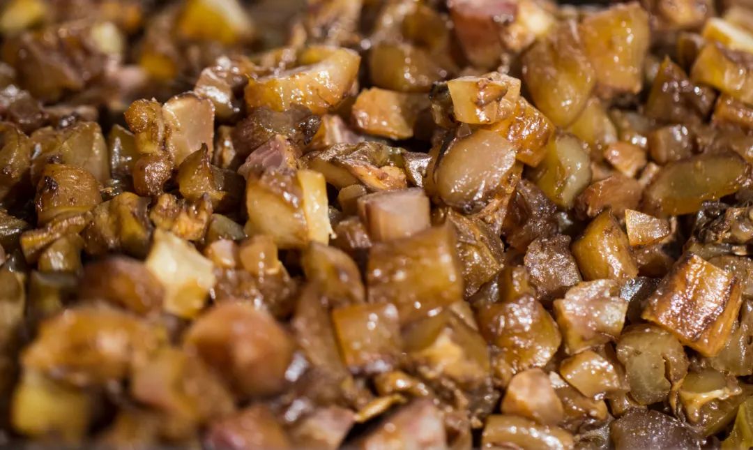 所谓脆哨,就是调味后炸到酥脆的五花肉,通过米酒、酱油、陈醋、白糖调味和香料的魔法,以及小肉丁在高温后发生的美拉德反应,一起变成“肉香小炸弹”。小小一颗在嘴里嘎吱嘎嚓地发出脆响,肉香、酱香、咸香,酥脆的口感,还有油炸带来的荤香都在嘴里爆发。