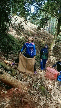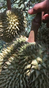 在泰国,采摘榴莲需要至少两个人配合,一个人爬树上把榴莲弄脱落,另一个人在树下用麻袋接着。在越南,采摘装备改成大铁盆,用头顶着接。在马来西亚,以上两种方法被明令禁止,只能等待榴莲自动脱落,但这样保质期就救不回来了……