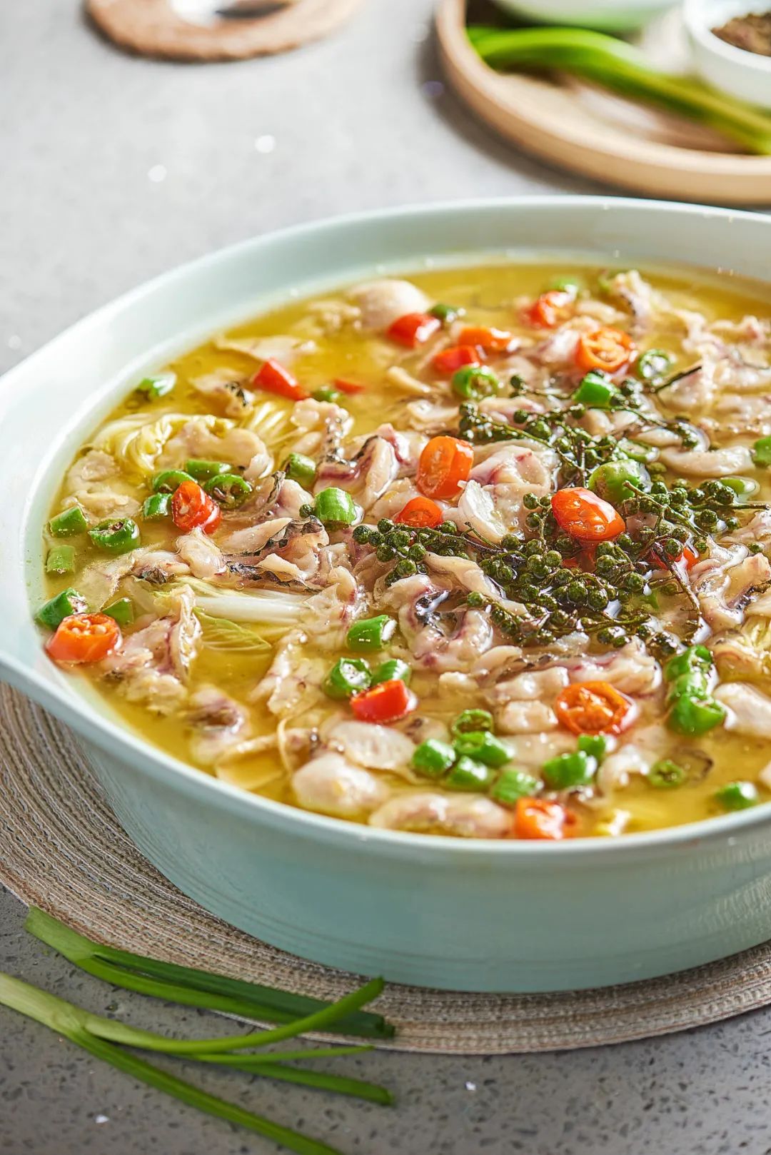 青花椒的风味清新飘逸,麻感强、麻度低,适宜口味鲜麻的菜品。青花椒鱼和藤椒钵钵鸡就是两款典型的清鲜微麻美食,相比于传统水煮鱼的重麻重辣,新鲜的青花椒只要在锅里稍微一煮,浓郁爽香的风味便会立刻释放在汤汁里。