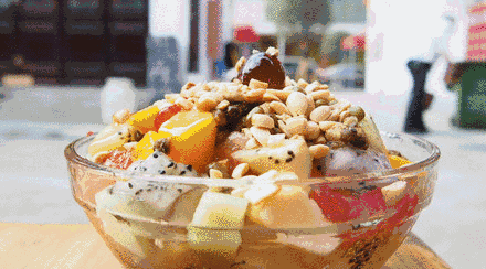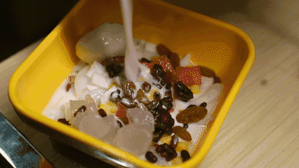 四果汤大多以蜂蜜水作汤底,“四果”的搭配千千万,堪称甜品“碰碰车”:西瓜、菠萝、芒果,还有红豆、莲子以及各种蜜饯、坚果、陈皮最后锉几下冰块,舀一大勺糖水,这解暑的冰甜汤算是齐活了。
