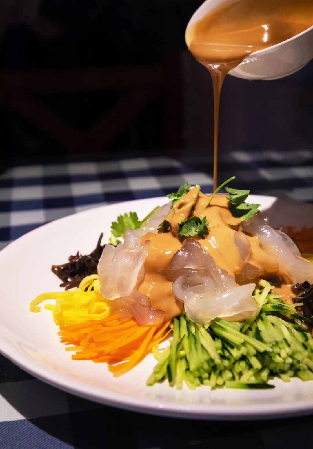 东北大拉皮尝的不仅是拉皮绵软细腻的口感,黄瓜丝,香菜,萝卜丝,纷纷齐聚“开会”,让大拉皮多了一层筋道的口感。再加上酱油、老醋、麻酱、蒜泥等调料,吃起来非常过瘾。