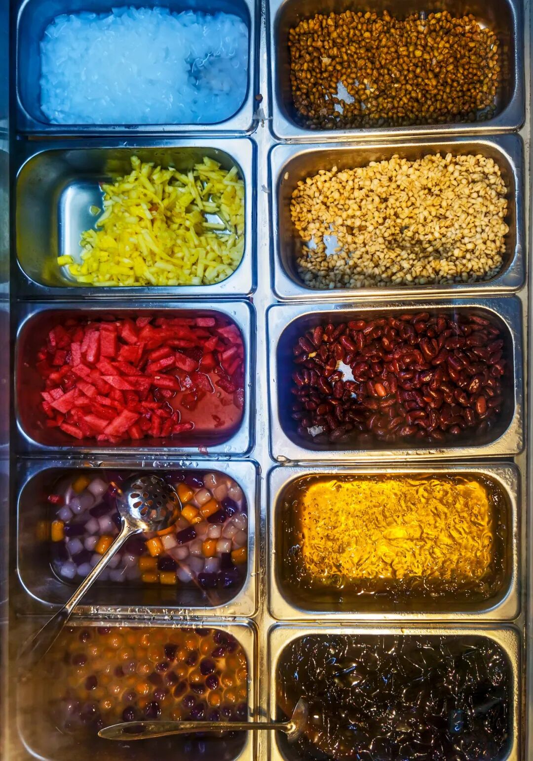 红豆、果粒、芋圆、冰淇淋等食材,都是清补凉里的常客。作为灵魂的椰子,永远坚守着清补凉椰子味的“尊严底线”。清补凉的另一制胜点是出其不意的配料,你以为它是椰香版四果汤,结果粉丝、鹌鹑蛋也经常见到,不管是啥,总能融入清补凉的味道,甜而不腻、爽滑润喉、冰凉可口。