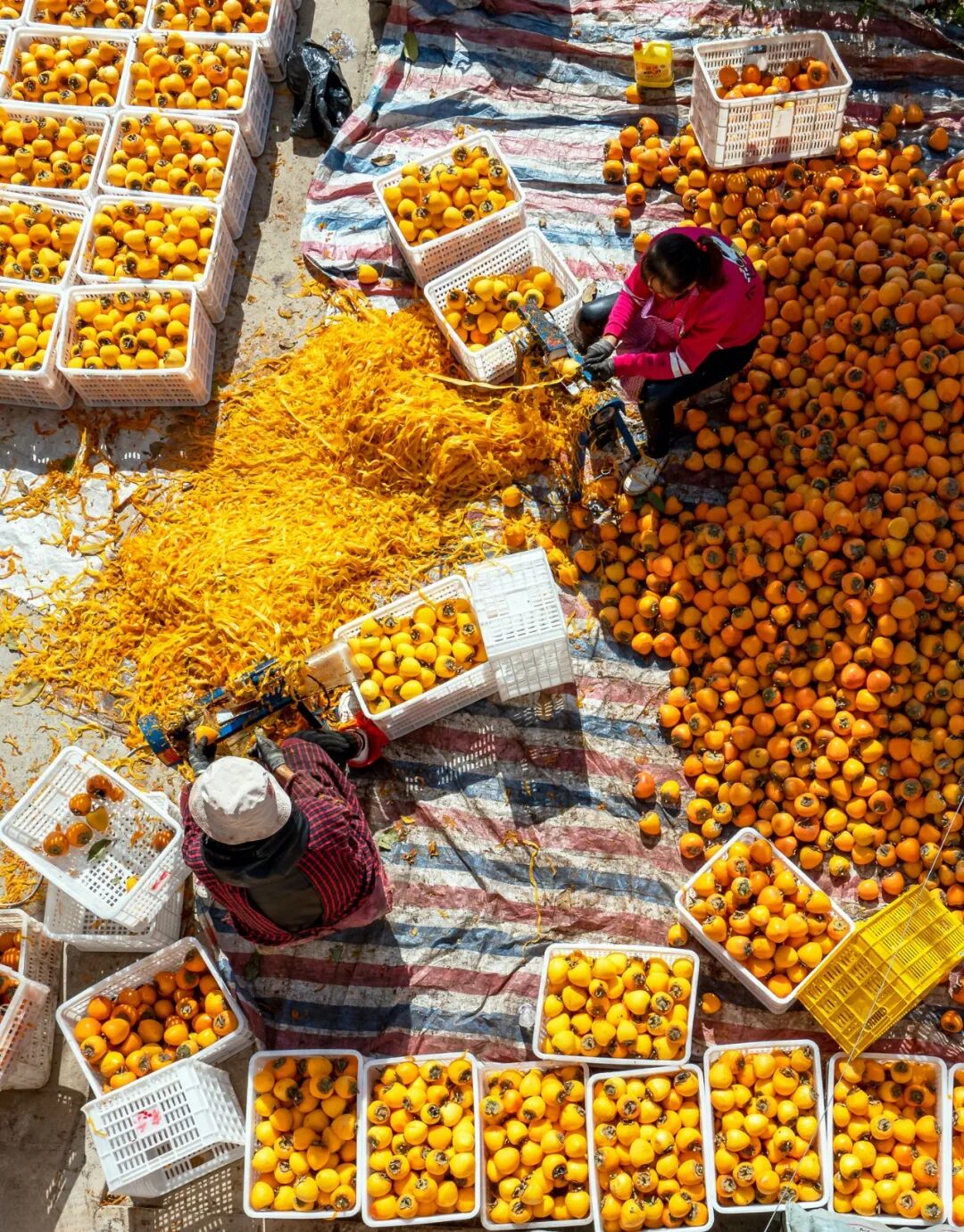 富平人遵循着自然节气,只用霜降后采摘的柿子当原材料——只有温度足够低,柿饼表面才能结出诱人的糖霜。再经过一个多月的等待,用风与阳光的力量将其变成“饱经风霜”的柿饼,这个过程被当地人成为“吊柿子”。