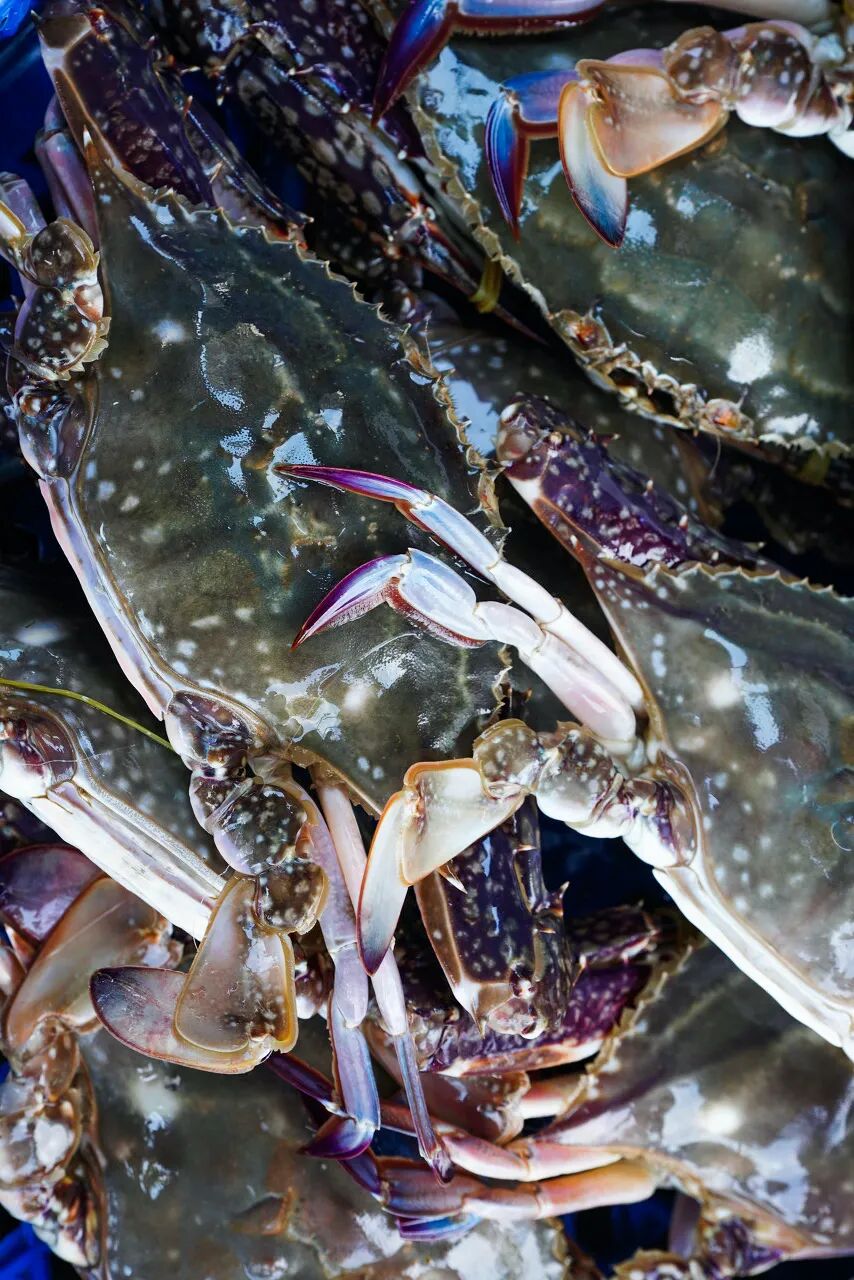 掂掂分量,看梭子蟹背壳是不是呈紫色褐色,肚脐部分则以深黄或偏红的为美,本地方言称之“蟹老结”;再捏捏蟹脚和蟹体处连接处是不是紧实,来判断螃蟹新不新鲜,若软扑扑的,说明没肉,若硬邦邦的,别犹豫!赶紧买下!