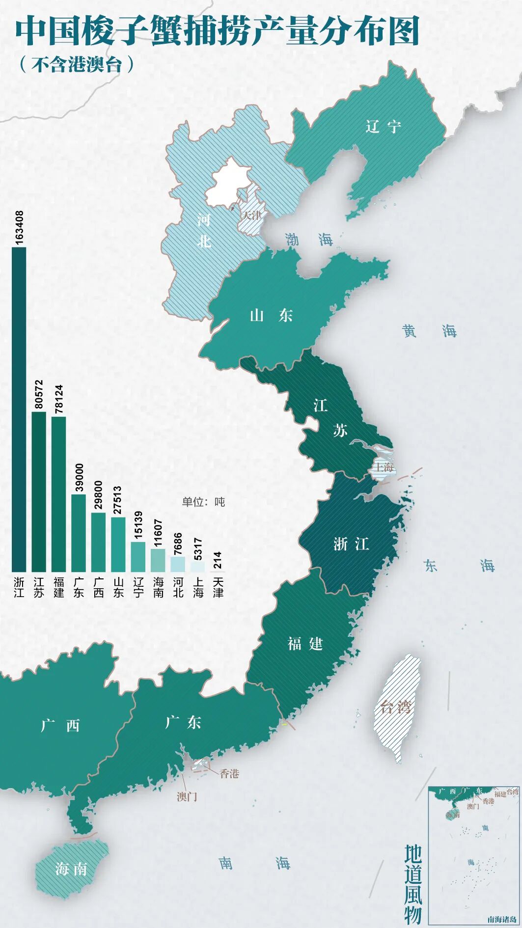 ▲ 浙江占了中国梭子蟹产量的大头,舟山又是浙江的梭子蟹主产地。制图/莫奈