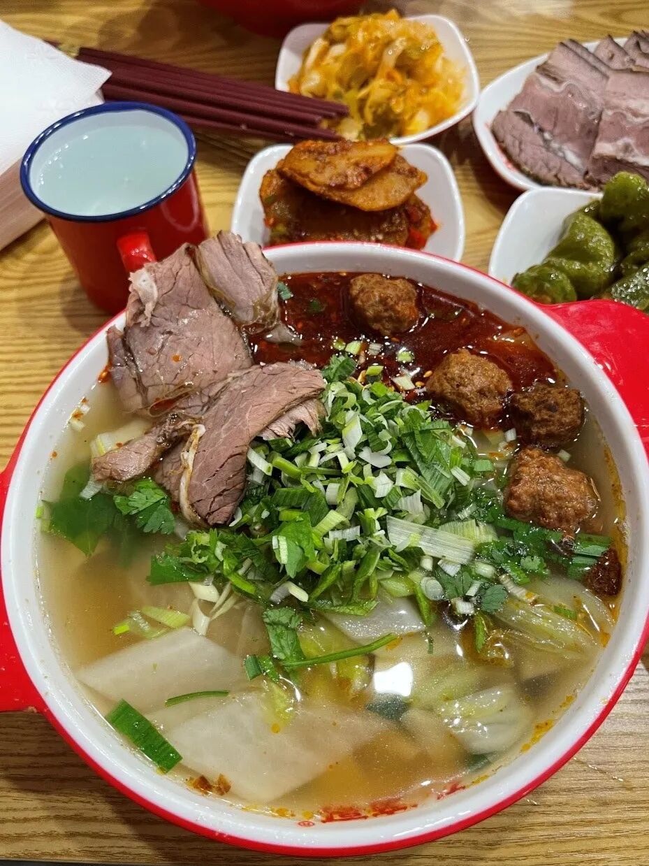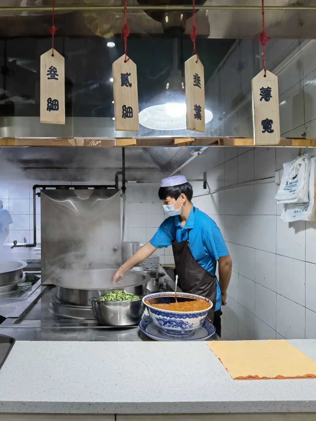 中山桥畔的磨沟沿因汤头鲜美著称,黄河边上的吾穆勒,牛肉有口皆碑,雁滩的白建强门口,常年复刻九十年代的蹲马路牙子吃面场景。对于兰州以外的甘肃人,更熟悉的则是陈记、思泊湖、唏嘛香、东方宫等连锁品牌。