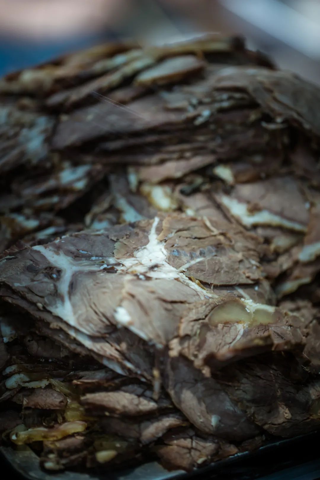 夹花肉,瘦肉带嚼劲,肥肉奶口,最适合泡在牛肉汤里,刚柔并济。好的牛腱子肉是怎样的?甚至会泛绿光,这可不是变质,据说是肌纤维在切面上排列成了规则的微观结构,造成了光的衍射。