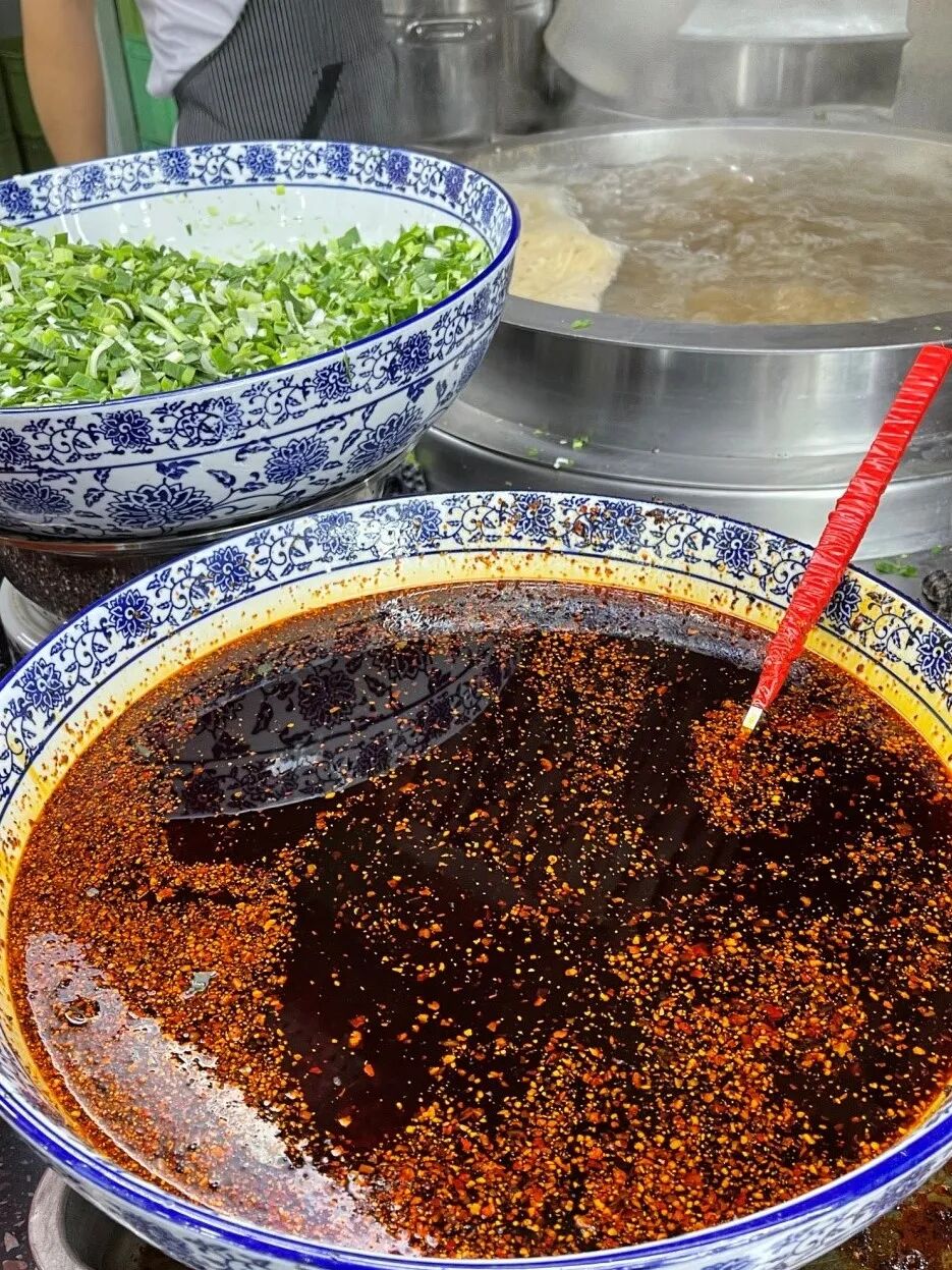 兰州牛肉面的辣子,以天水甘谷的辣椒为上,椒身长,皮质厚,色泽好,香而不辣。菜籽油作为基底,葱、姜、蒜、洋葱等调香,然后再放入10多种香辛料,其中的门道,不比熬制汤头简单。