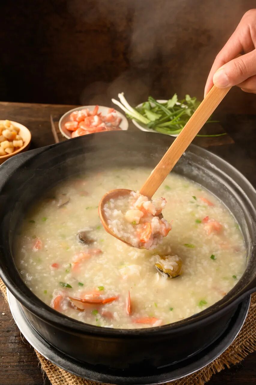 正因为是日夜陪伴,潮汕人对粥的要求很高:必须要有双重口感,米浆煮出来要滑稠,米粒还要有嚼劲,缺一味就退货。