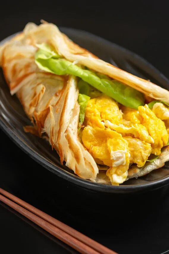 就说这“台湾手抓饼”吧。它看着,有点像鸡肉卷和煎饼果子的中间体,一张油煎千层饼,卷着香肠、青菜和鸡蛋。重点是,我在记忆中搜索了半天,也没找到它在我国宝岛台湾的对应。
