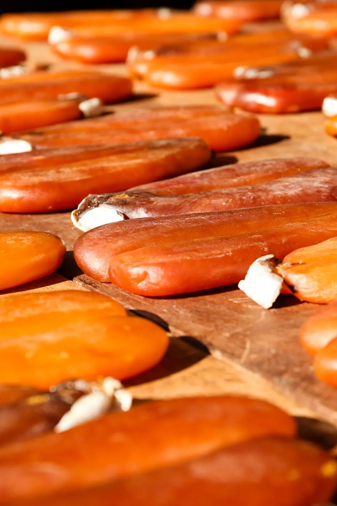 乌鱼子,台湾中南部沿海特产,全中国独此一味。它是乌鱼的完整卵巢,取出漂洗后以木板压制、除水定型,再用麻绳串起,自然晾干。制作过程中,乌鱼子自然发酵、变性,不仅身躯染上诱人的琥珀色,内里也变得弹牙紧实,浓香替代了腥臊,形成极为特殊的风味。
