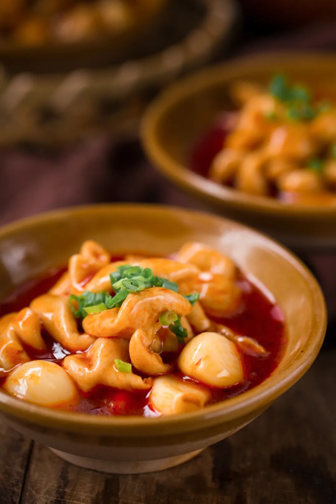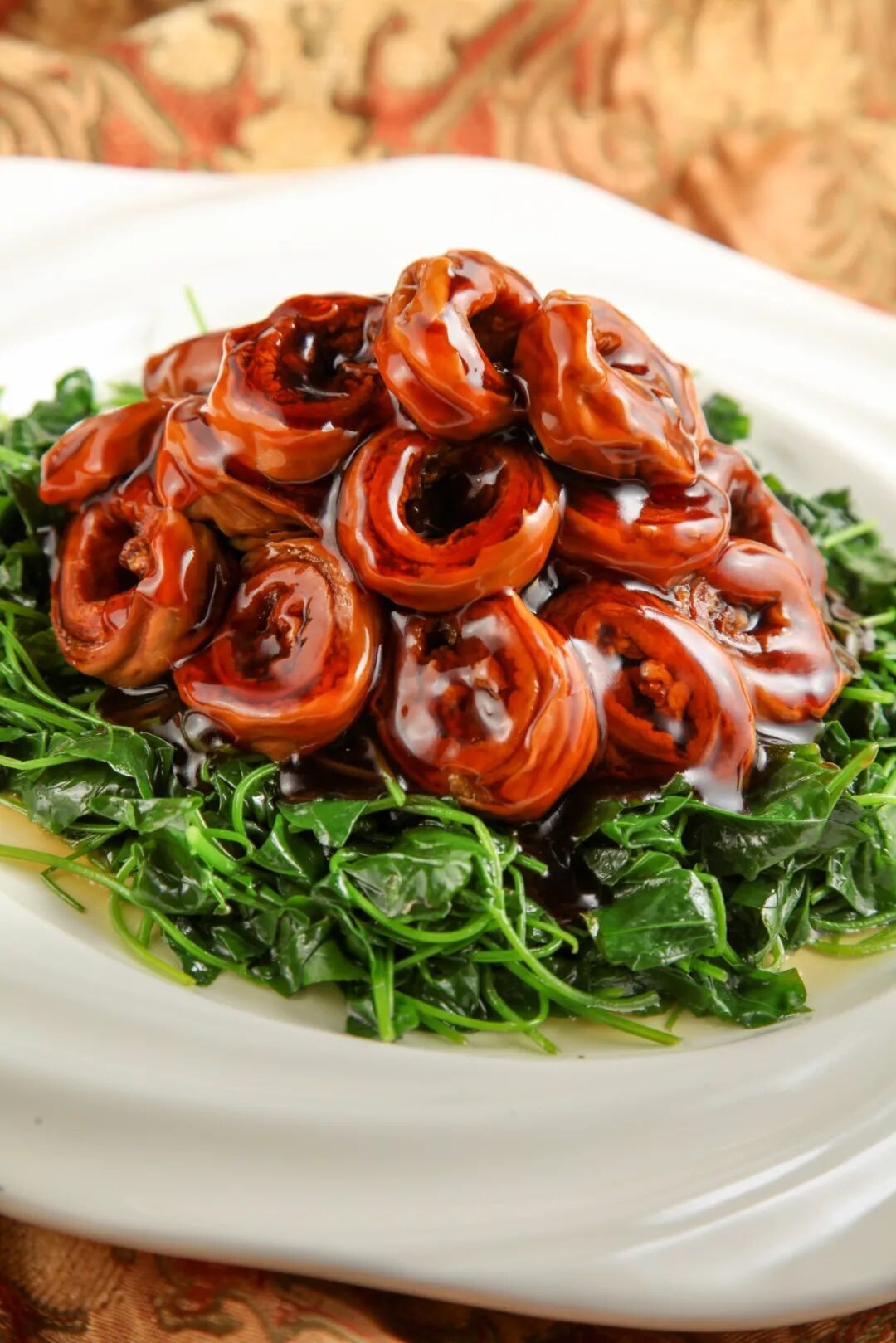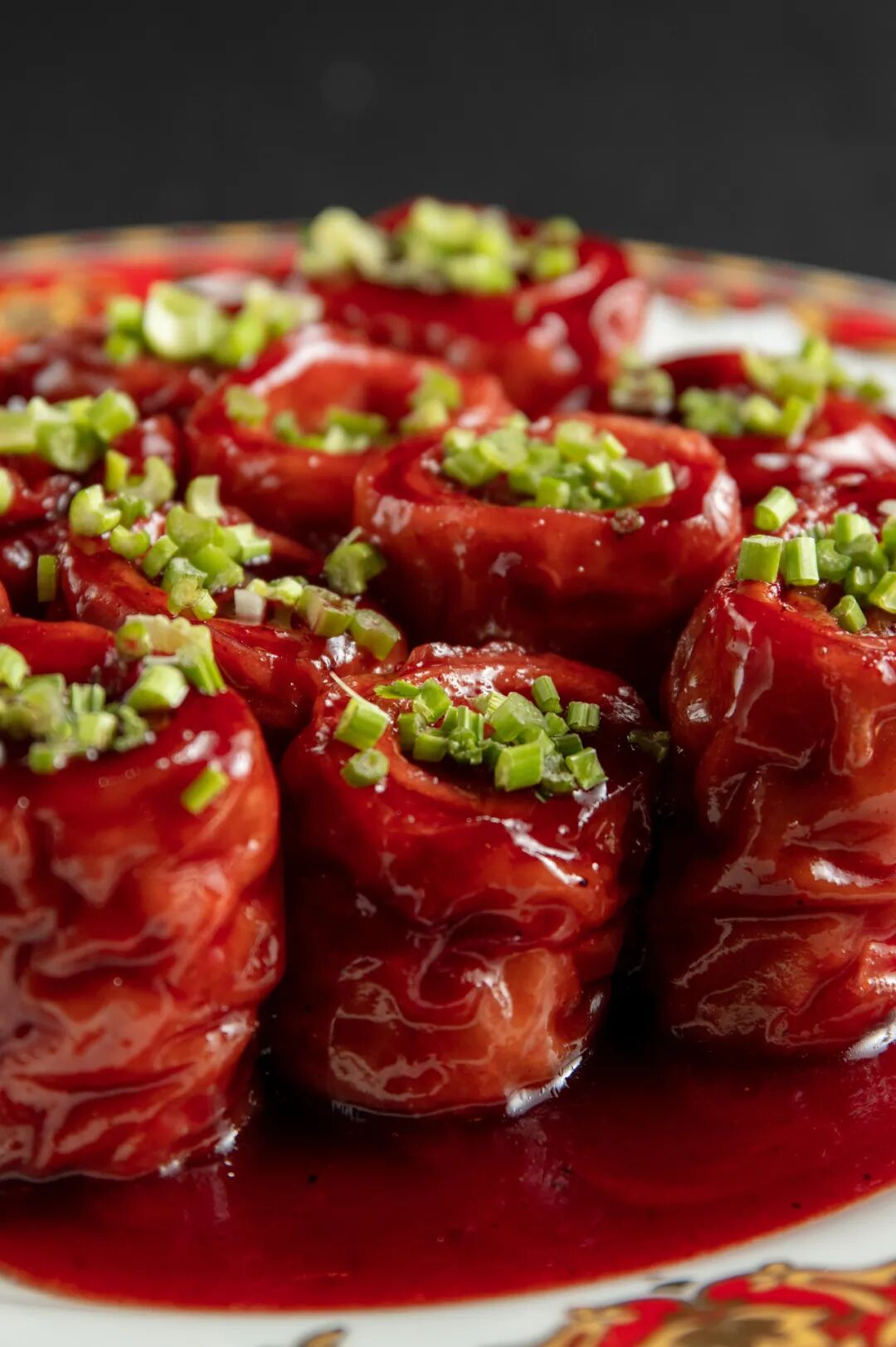 出了上海往北走,一直到胶东半岛,九转大肠便是鲁菜门面之一。一段大肠,需要先煮、再炸、后烧、煨透,还要做成“肠套肠”,其工艺之繁复,说是九九八十一转大肠也不为过。这九转大肠,五味聚合,口感兼具软糯脆韧,还要像树桩一样立起来,讲究得很呢。