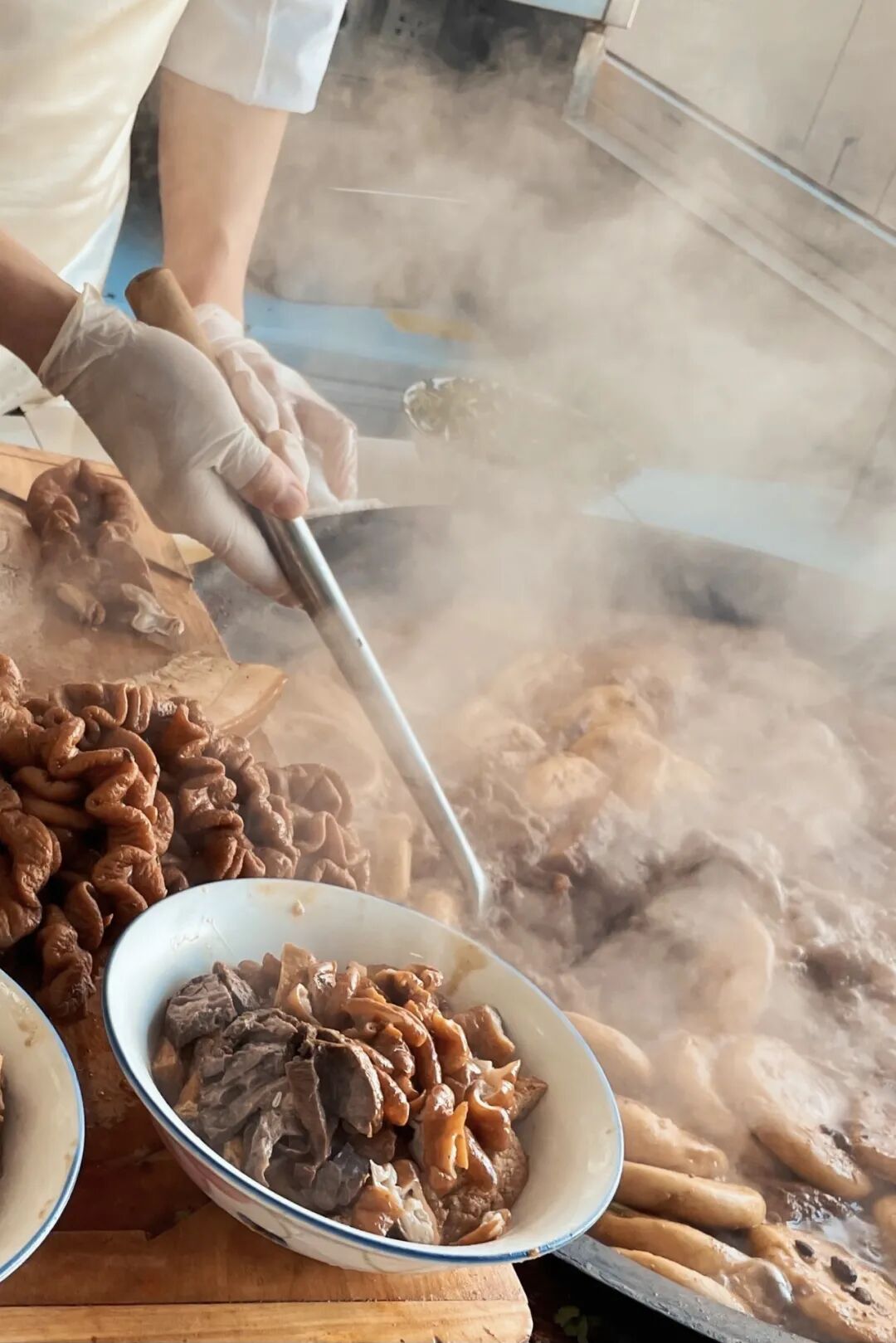 一锅羊杂汤,还要走过汤生的三个阶段。第一种叫“原汤”,由清水加调料直接熬煮,熬得羊杂脆嫩、汤头鲜香,但得起早贪黑抢头锅;第二种叫“清汤”,羊杂入锅前先汆水,缩短熬煮时间,只留羊杂的嚼劲;第三种便是“老汤”,酱锅老卤让羊杂完全入味、软烂,吃着下饭。