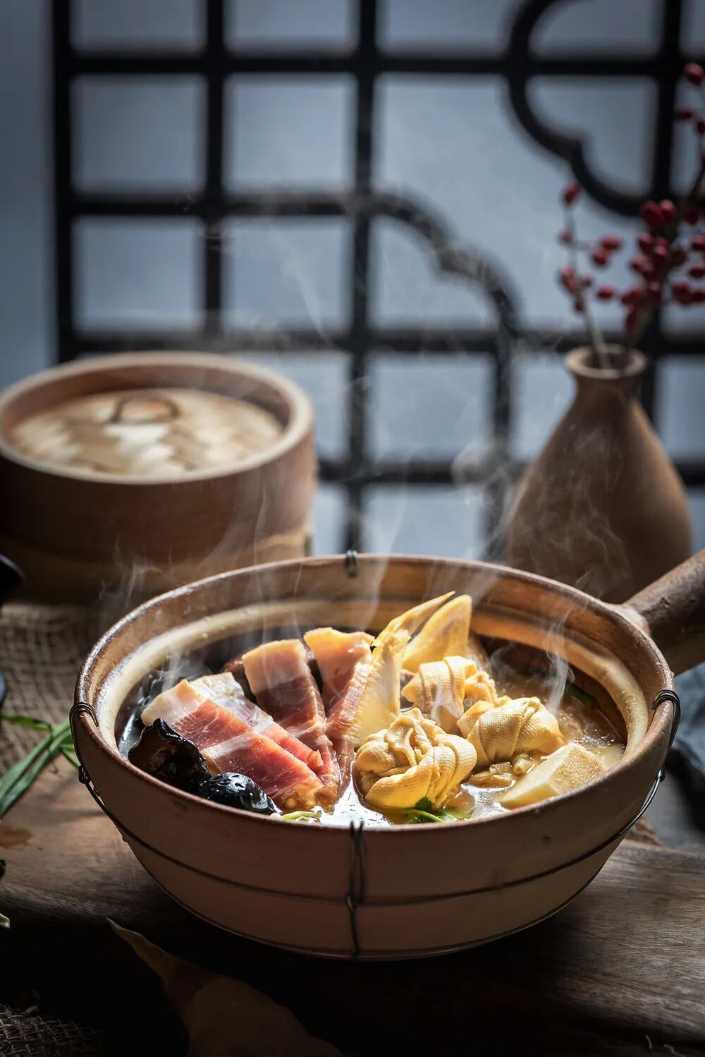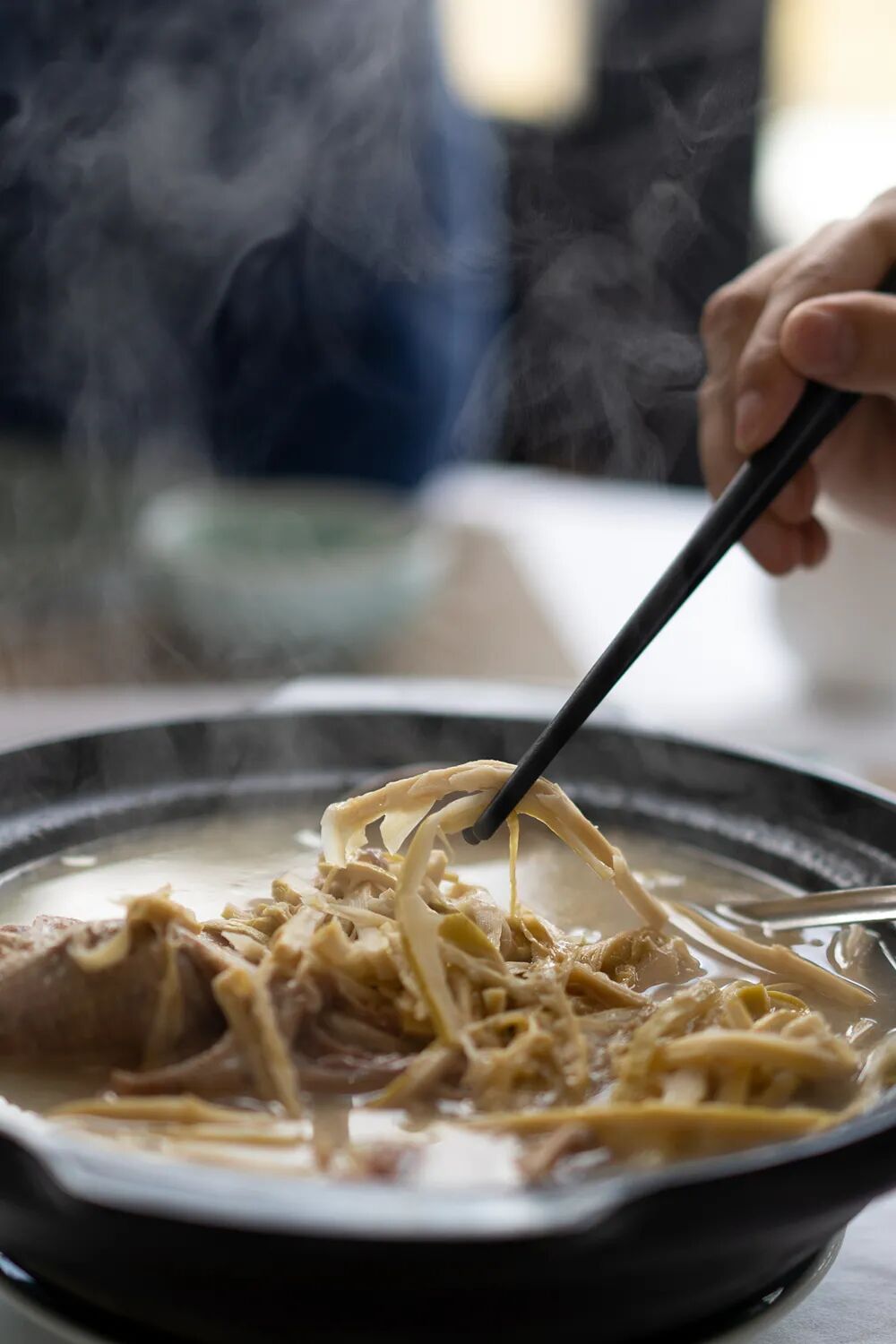 提到冬笋,腌笃鲜就跑不了。有人说,腌笃鲜要用春笋,然而真正的吃货,是等不及来年春天的。你看这冬笋鲜嫩异常,敞开身躯拥抱咸香筋道的老火腿、丰腴肥硕的老母鸡,再游走些提升口感的百叶结,就问你舒不舒爽?