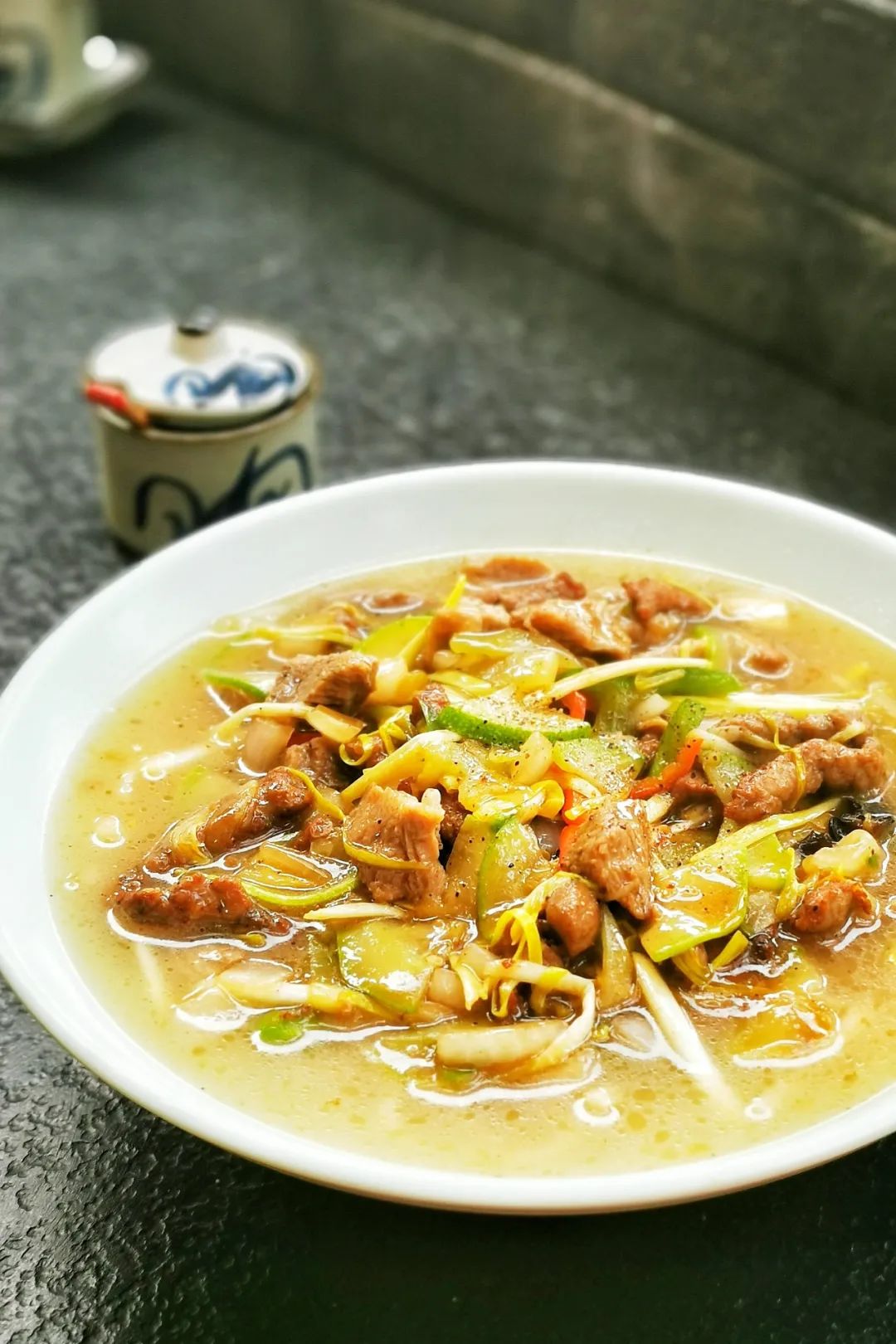 你看这碗淮安杠子面(是不是听着就很北方?),它以大骨熬汤、碱面下锅快煮(是不是听着就很南方?),在碗里汤是汤、面是面(又很北方了),看似互不干扰,实则味道早就化在了一起。这还没完,它的精髓是浇头(瞬间又南方味了),水里游的长鱼、虾仁,地上跑的大排、肚丝,全都能给你加进去,这就是淮安式的豪爽。