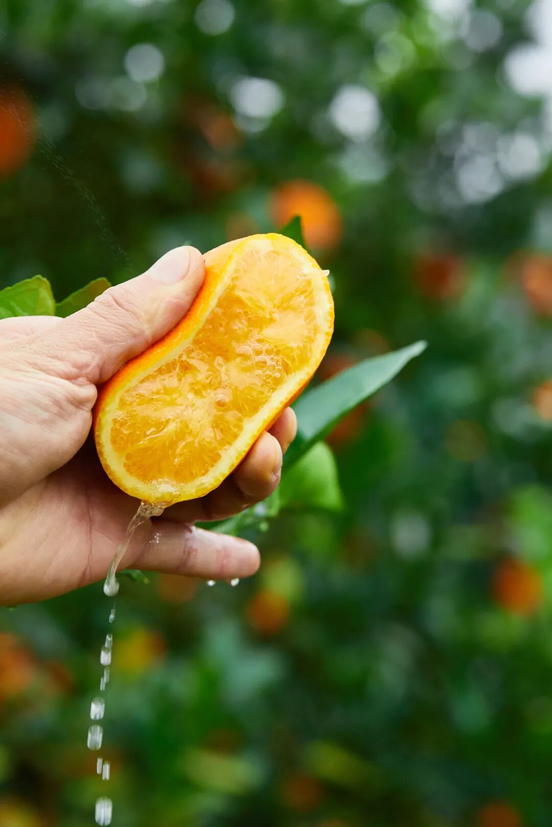 这颗17.5°橙,改良自赣南最好的品种:纽荷尔脐橙。它的外观呈椭圆状,果皮橙红鲜亮,质感光洁细腻,切开便汁水横溢;它的酸度低、甜度高,鲜食自不必说,更是绝佳的果汁原料;最惊艳的是它独有的香气,还没切开便沁香四溢,撩拨你的鼻尖与味蕾。