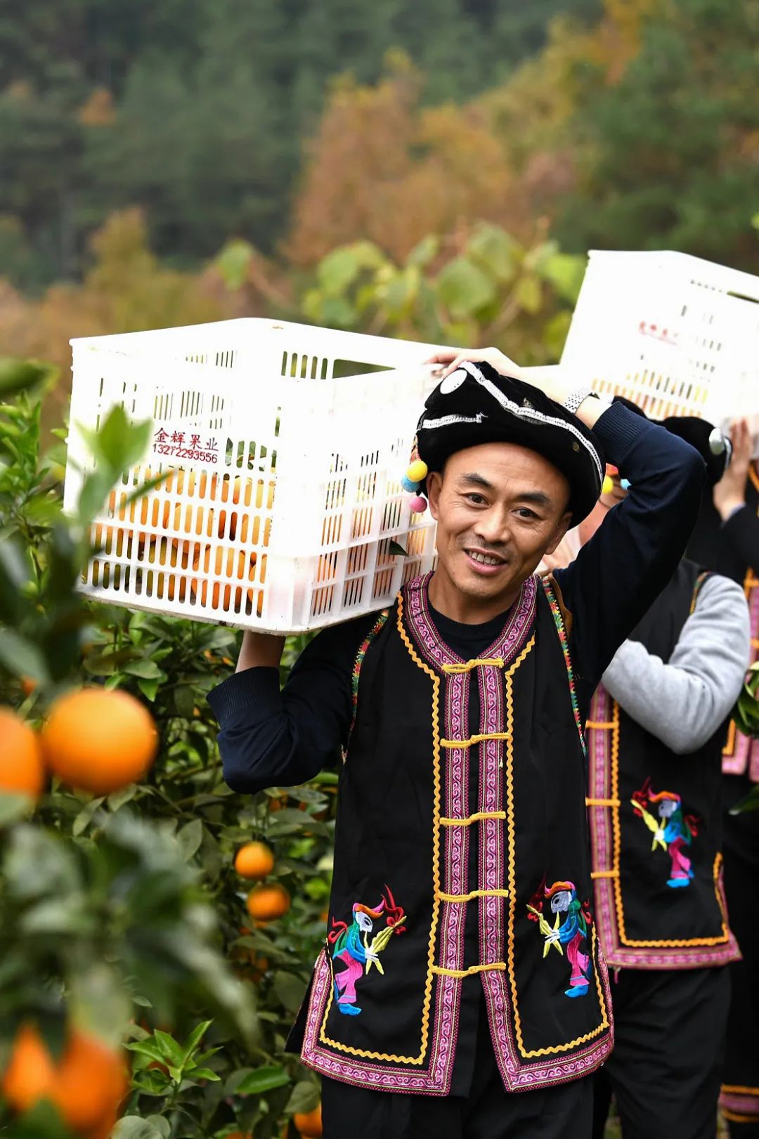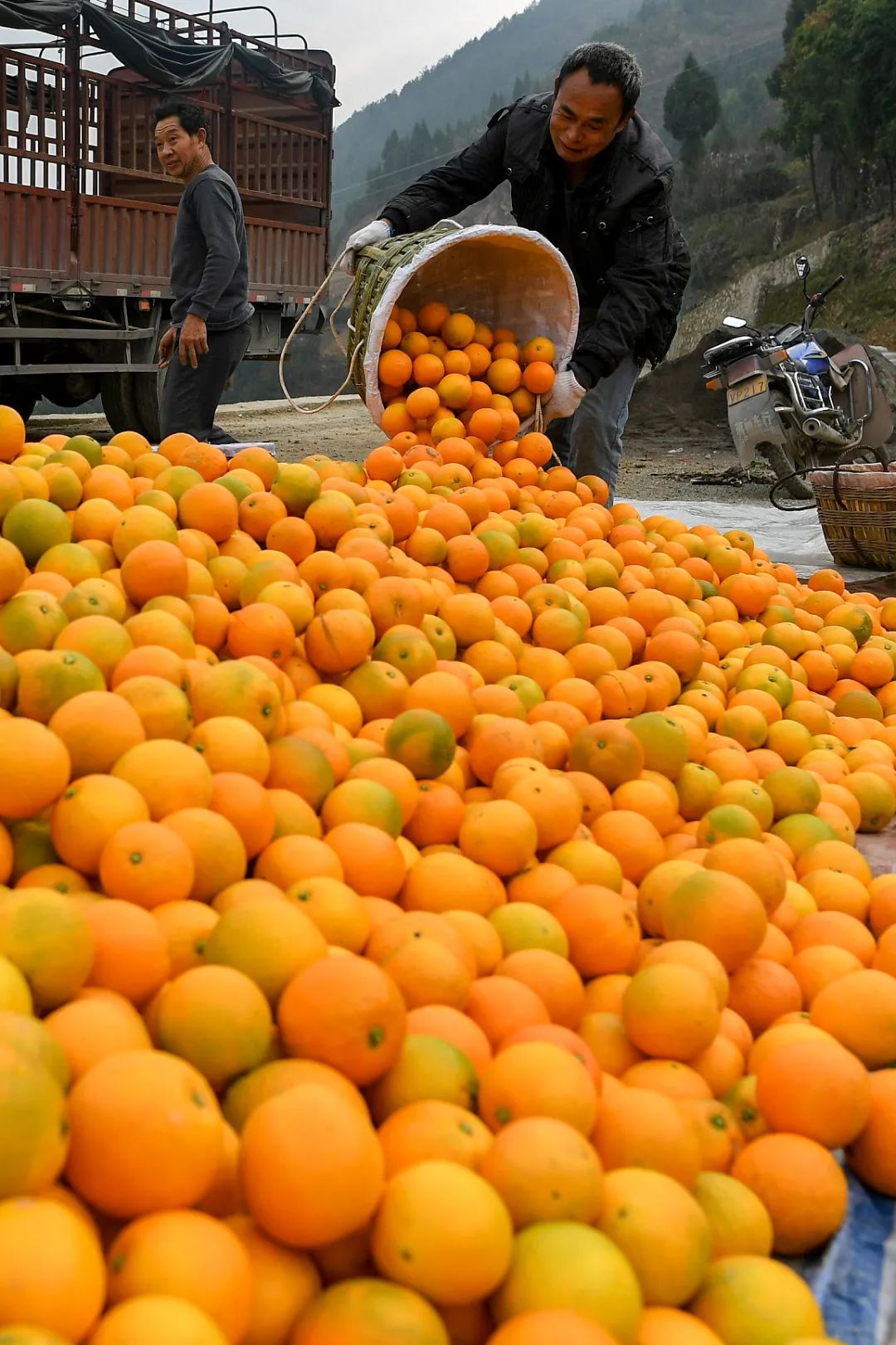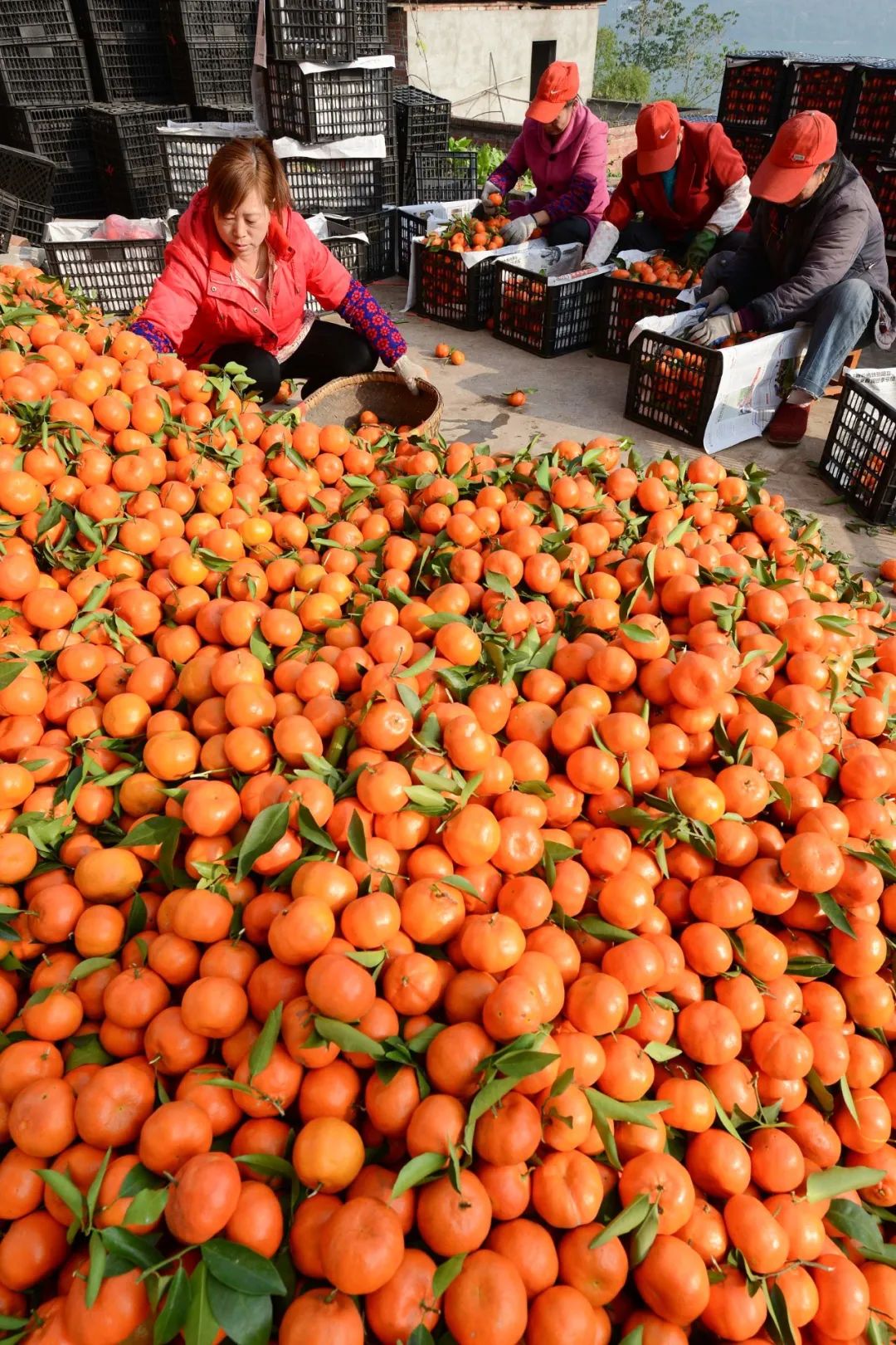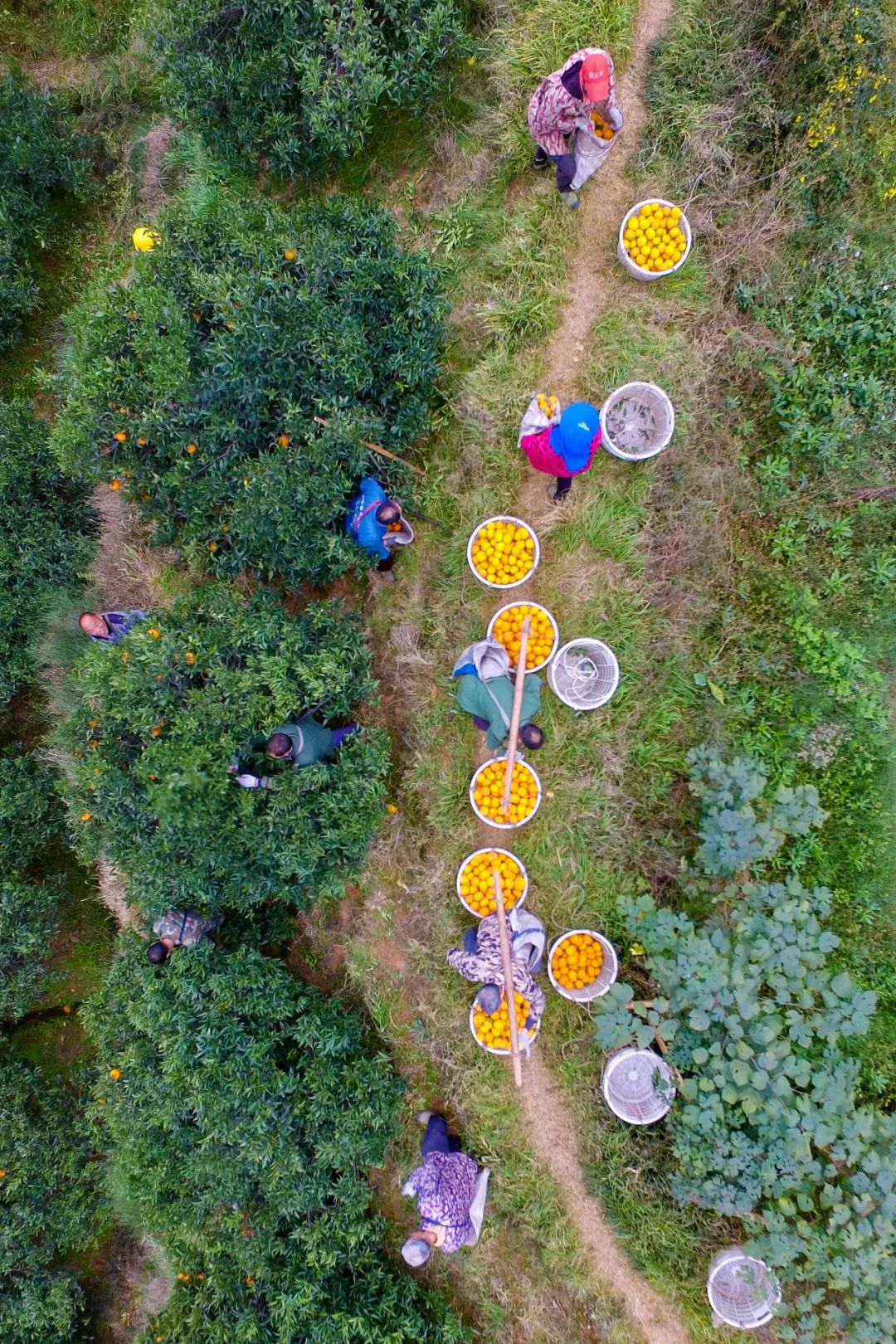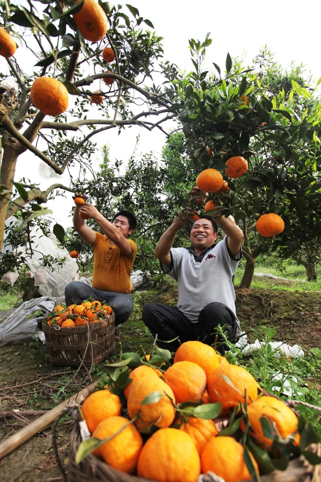 四川眉山,成熟的柑橘挂满枝头,农民在忙着采摘。
