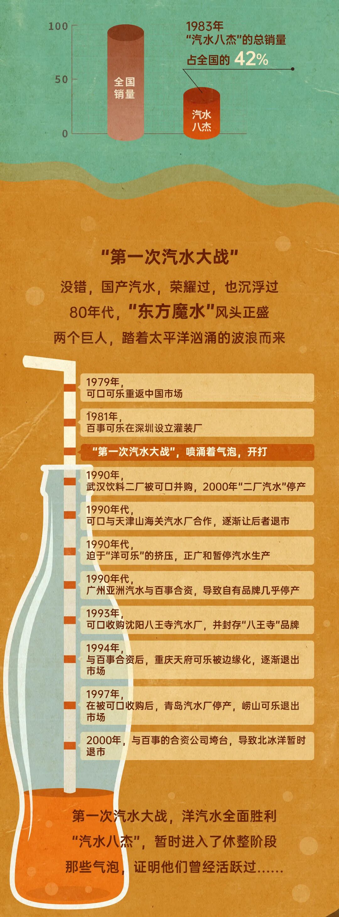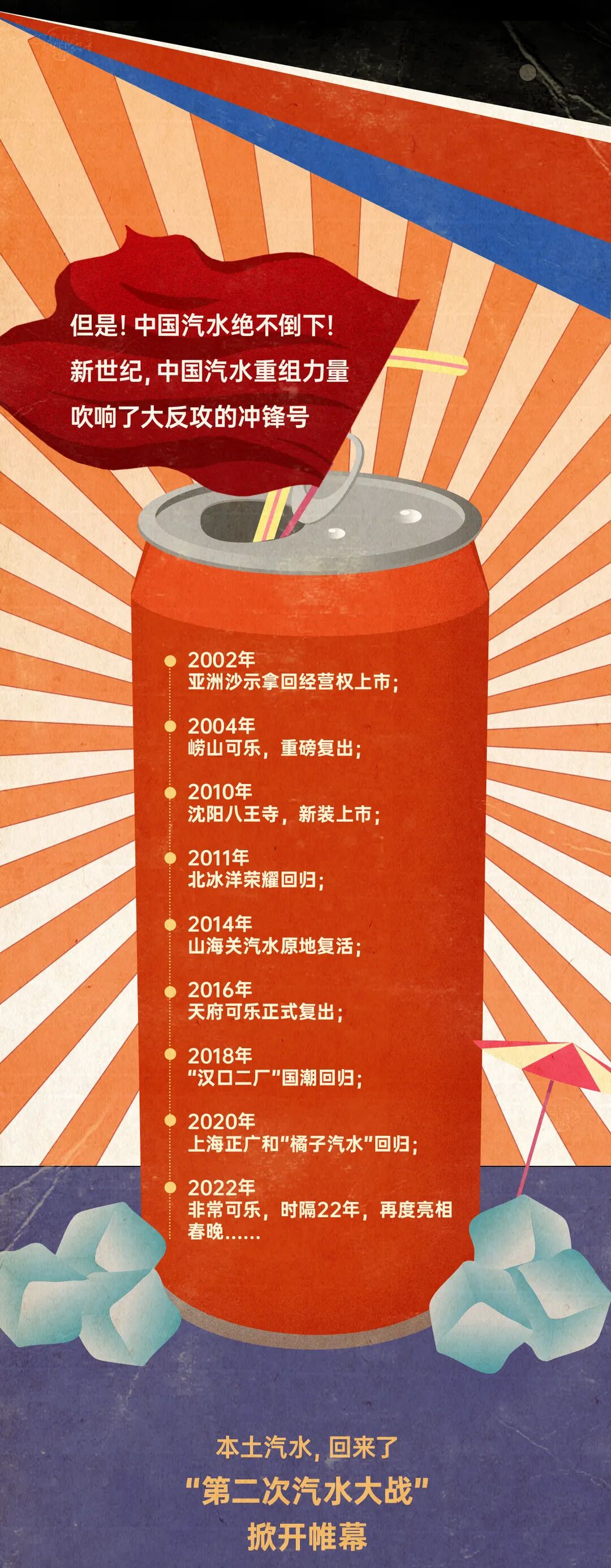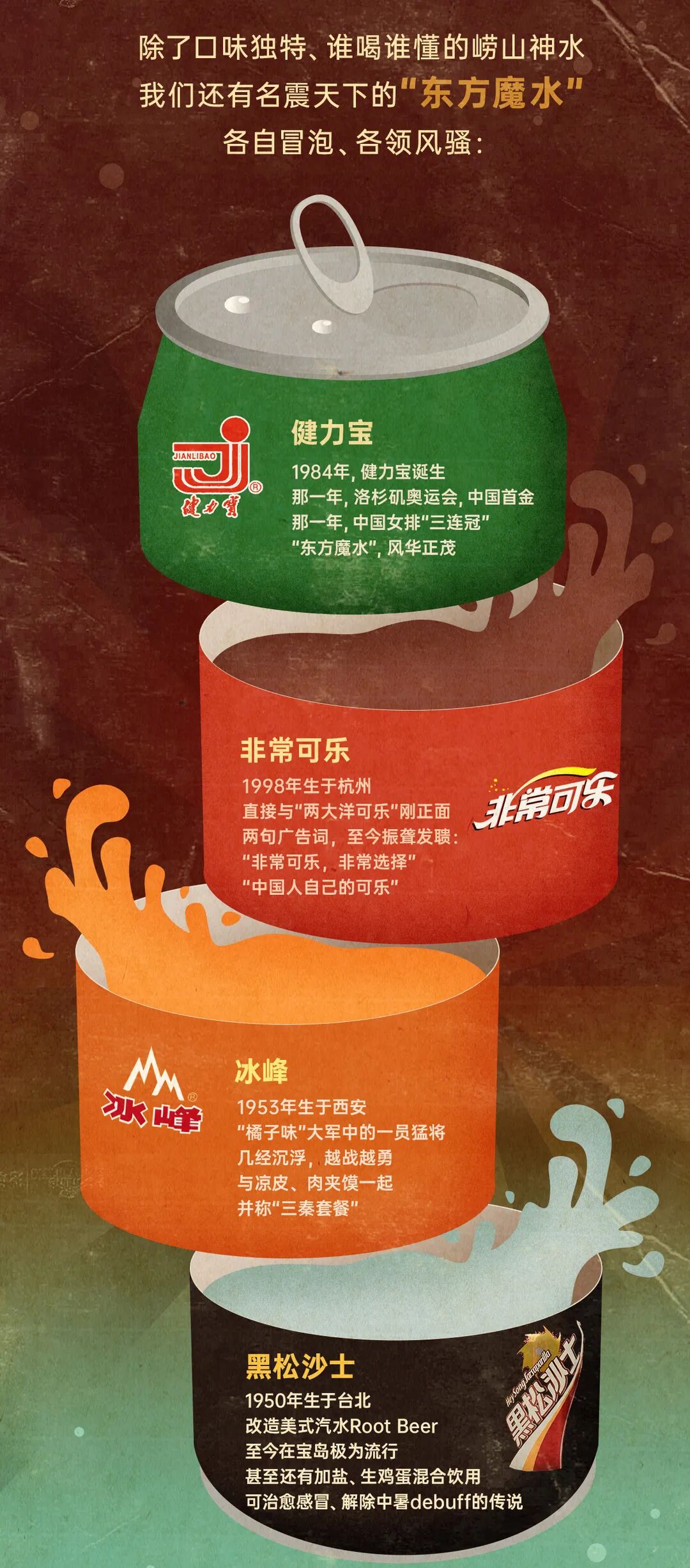 从一百多年前的“荷兰水”,再到十里洋场的“洋汽水”,以及新中国的“钢汽水”,无数快乐水一路走来、荣耀满身;从中草药配方的崂山可乐,再到传奇的“东方魔水”健力宝,以及异军突起的元气森林……中国汽水,一直生机勃勃,就和那咕嘟嘟的气泡一样,从未断绝。
