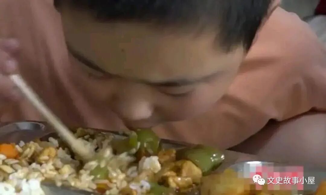 午餐是一大碗红烧肉、1大碗米饭和蔬菜。放学后回家和晚上七八点,等待他的还有两次正餐。临睡前,他还再往肚子里塞下一份鸡蛋煮面和一盒牛奶。