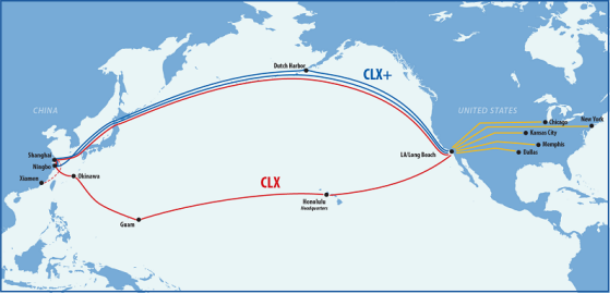 这条,跨太平洋精品快航CLX (China Long Beach Express) 始于2006年2月,依次挂靠宁波、上海,然后直达美国长滩港、夏威夷火奴鲁鲁港、关岛及冲绳港。上海至长滩全程10.5天,船只到达长滩港后,隔天即可在港区外堆场快捷提货,因此,这一精品航线可谓是开创了业界“快捷准时”的新概念。
