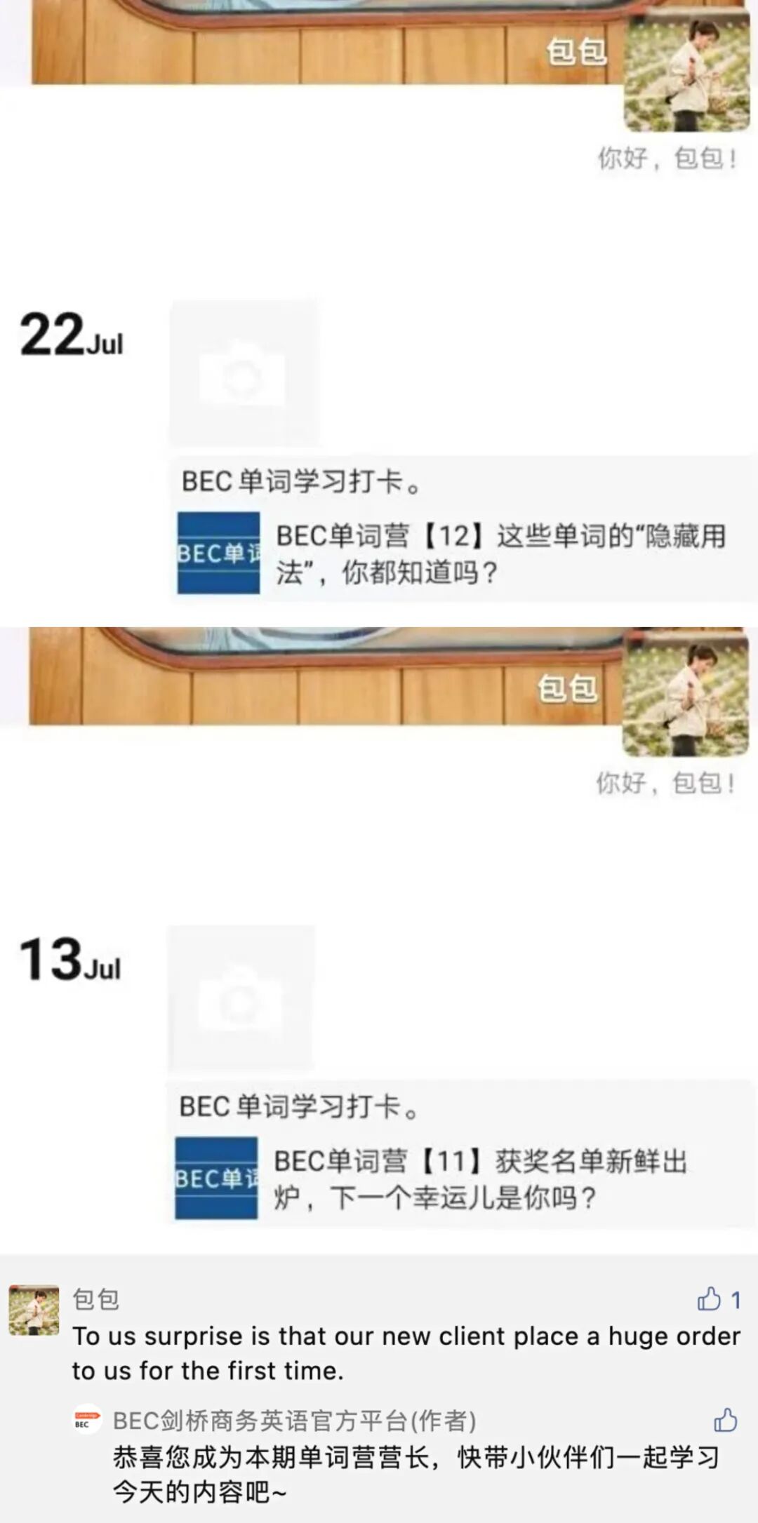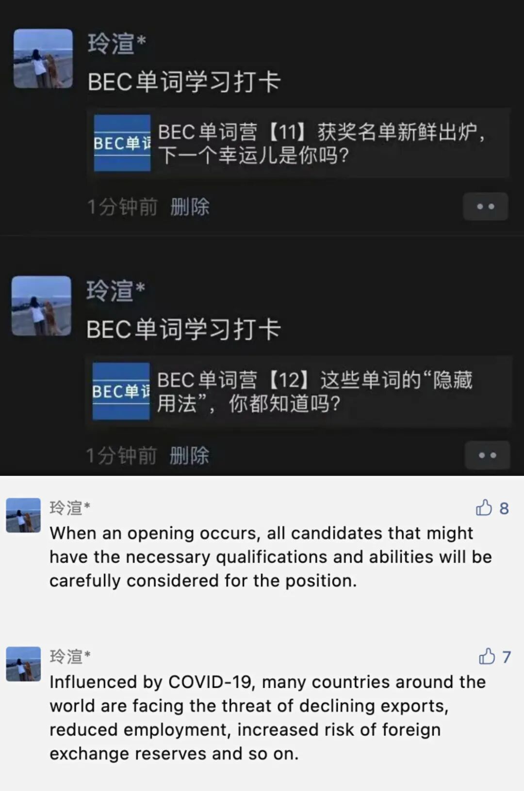 参与文章留言并转发朋友圈+文字“BEC单词学习打卡”,截图回传后台,下一个幸运儿说不定就是你哦~