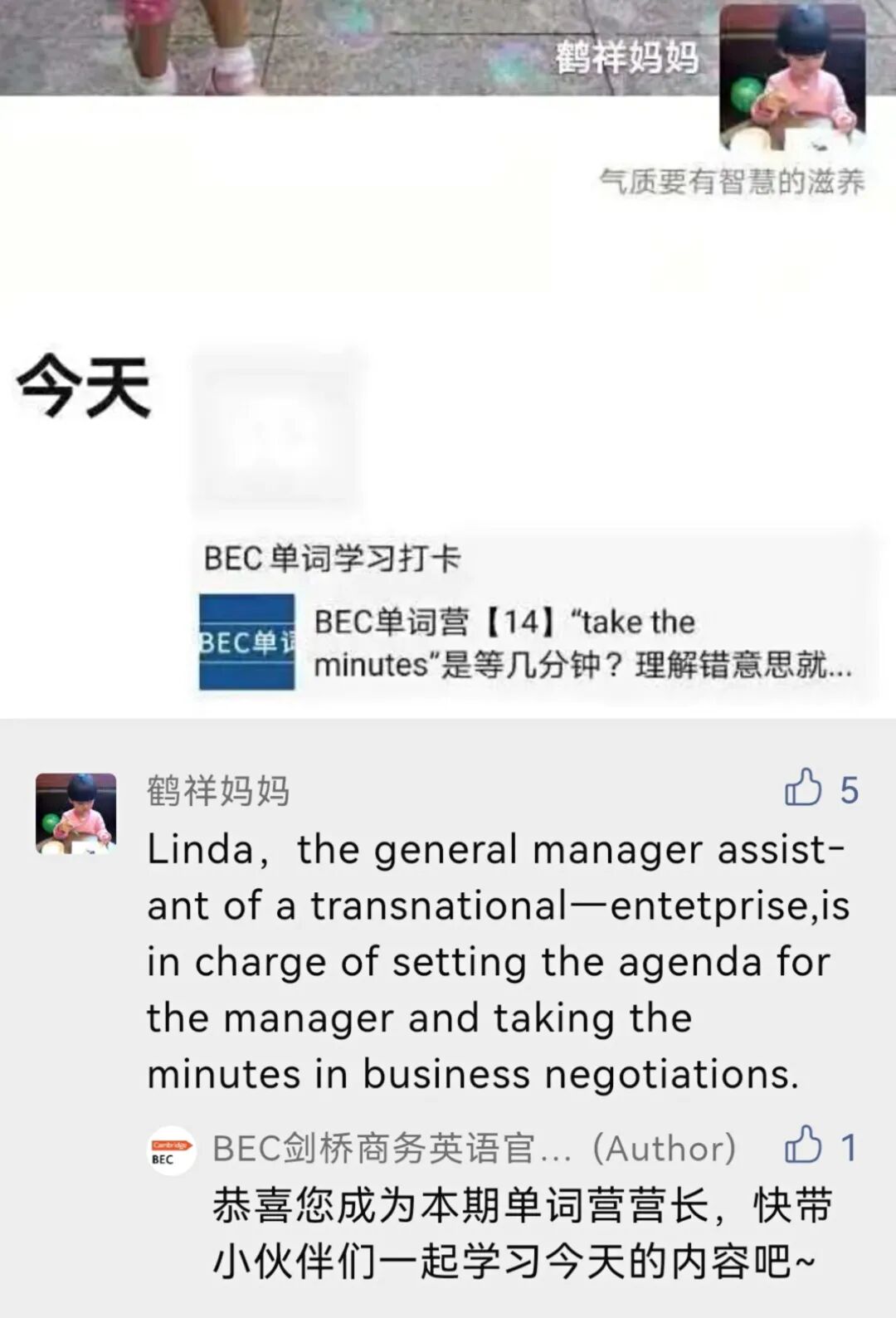 参与文章留言并转发朋友圈+文字“BEC单词学习打卡”,截图回传后台