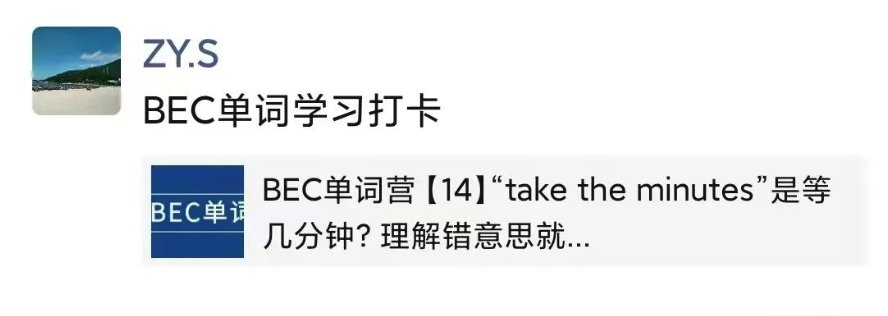 参与文章留言并转发朋友圈+文字“BEC单词学习打卡”,截图回传后台,下一个幸运儿说不定就是你哦~
