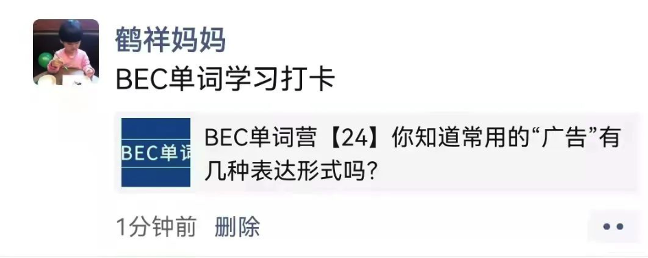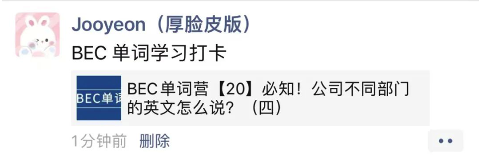 参与文章打卡留言,并转发朋友圈+文字“BEC单词学习打卡”,截图回传后台