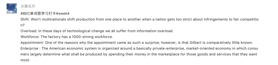 以上就是第五篇单词营学习干货,学习感觉如何?欢迎将你的精彩造句在文章下方打卡留言,快来做第一个留言者争当本期BEC单词营长,带领小伙伴们一起学习,共同开启职场闪光时刻!