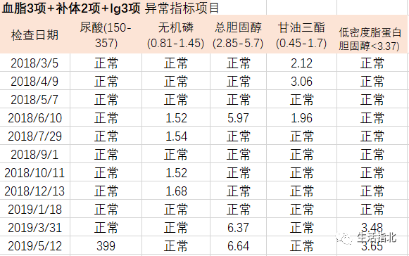 下图是血脂3项+补体2项+lg3项+肝功+肾全的异常指标部分截图,供大家参考: