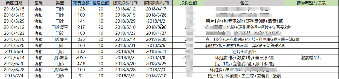 下图是记录用药花费和药物调整的部分截图,供参考:
