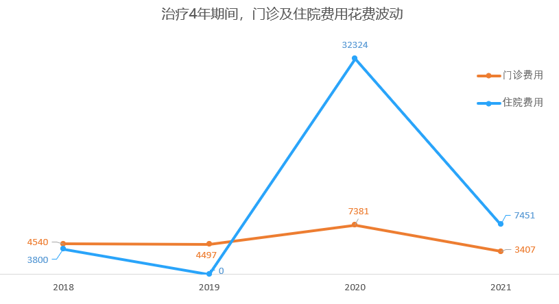 从整体四年的治疗费用来看,门诊的费用还是比较平稳的,每年花费约4900元,月均大概是408元。