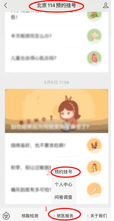 1)微信搜索【北京114预约挂号】,找到公众号,点击【就医服务】,会弹出【预约挂号】;