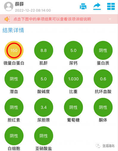 扫一次,直接能做12个项目检测,白蛋白、肌酐、蛋白质、潜血,咱们十分关注的指标都有覆盖,一分钟出数值,当时就知道具体指标数据,清清楚楚,非常满意了。