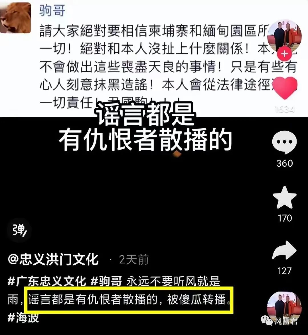 尹国驹矢口否认。他说:请大家绝对要相信柬埔寨和缅甸园区所发生的一切!绝对和本人没扯上什么关系!本人绝不会做出这些丧尽天良的事情!只是有些有心人刻意抹黑造谣!本人会从法律途经追究一切责任!