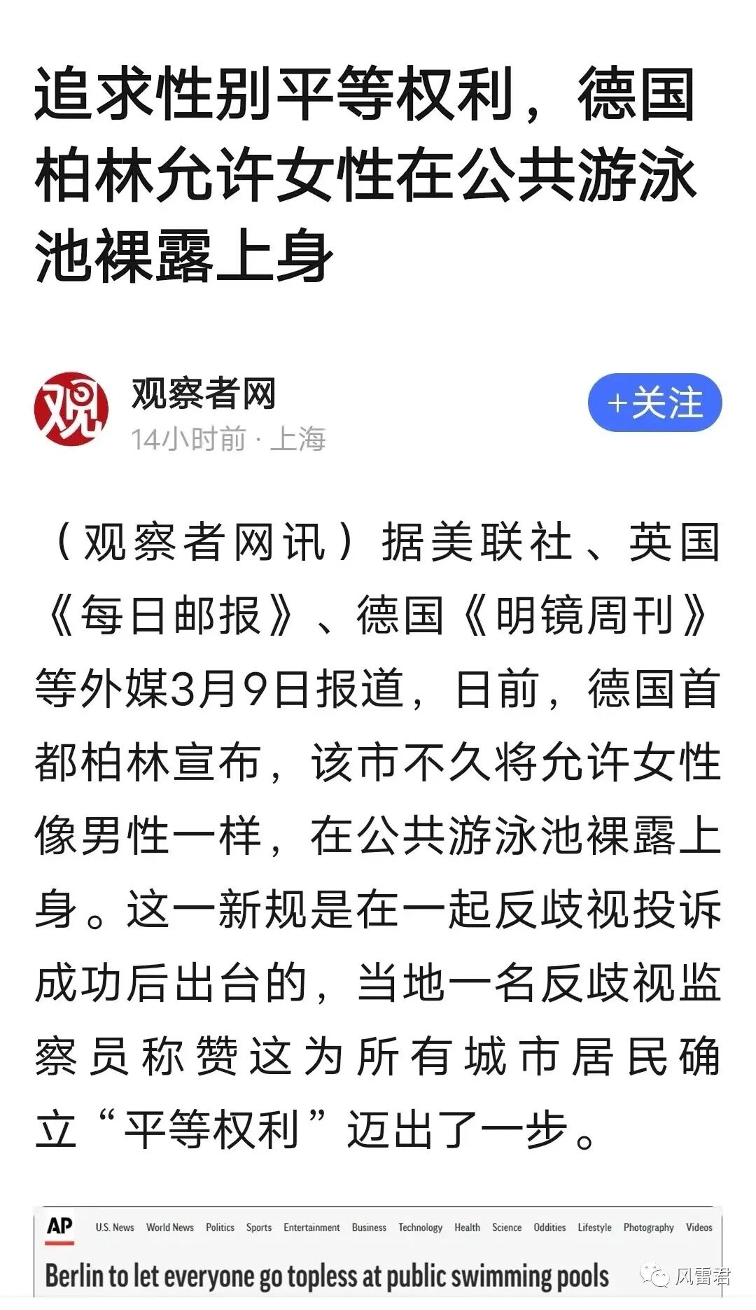近日,德国首都柏林正式下令,不再禁止女性在公共泳池半裸泳。